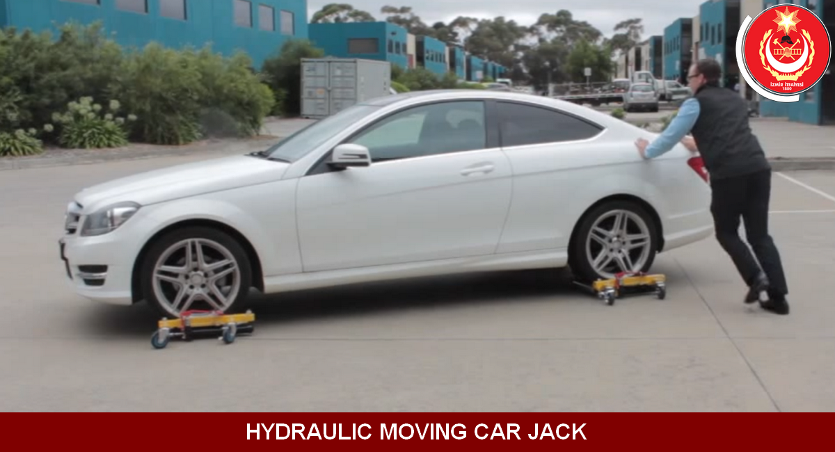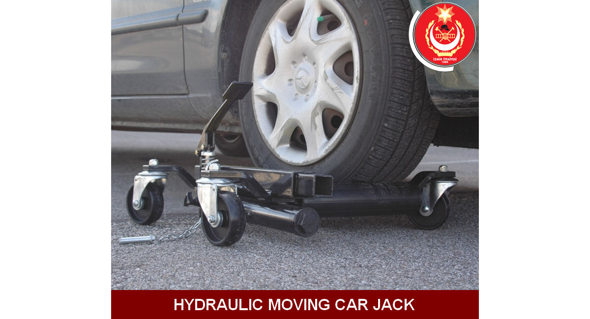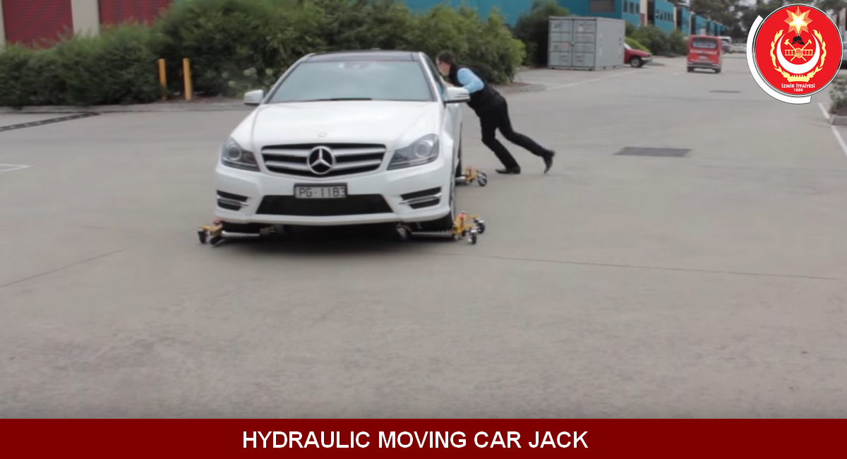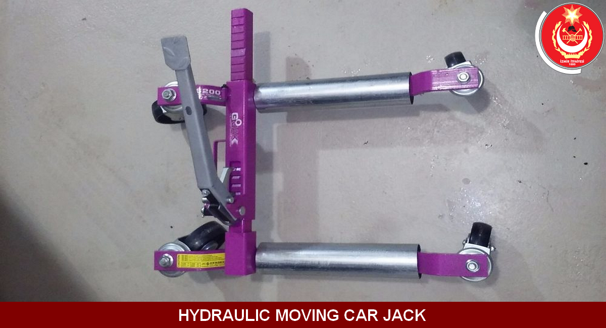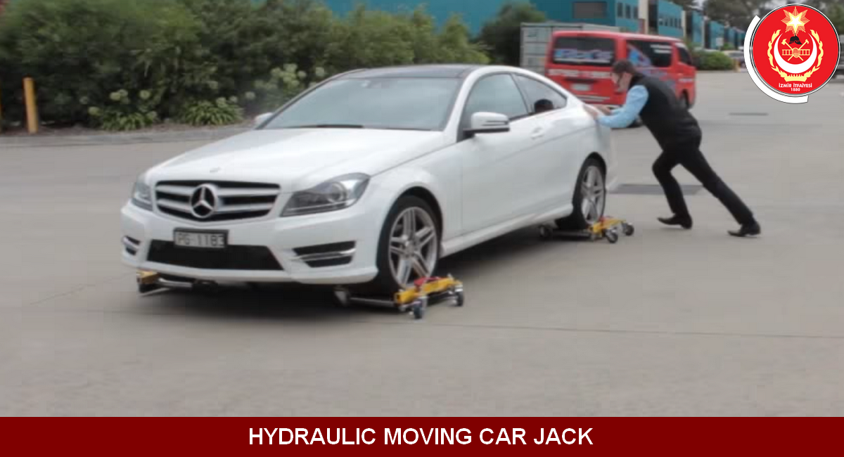 Being placed under the tire and the hydraulic mechanism is actuated by the pedals..