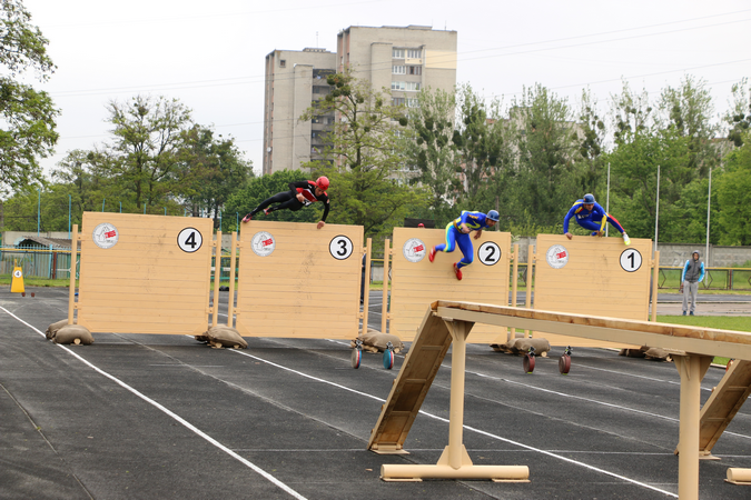 Passes over the balance board 1,5 meters hight and opens hoses on the ground.   Connects the hoses together.