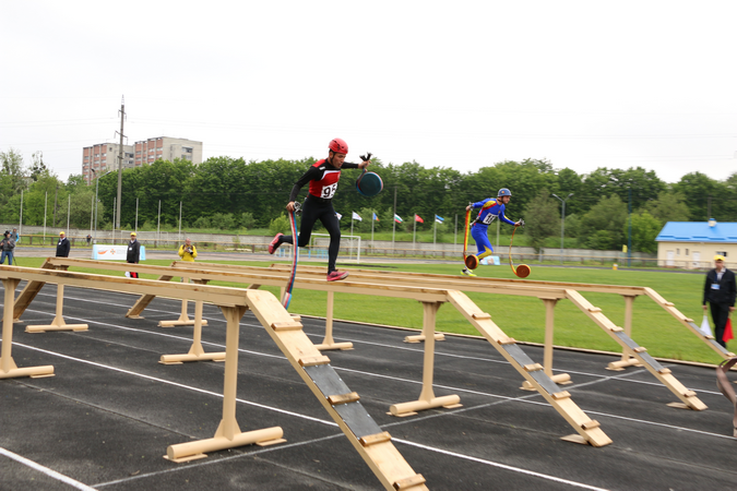 There are 2 hoses on the ground at a distance of 5 meters after obstacle. Takes hoses in both hands.