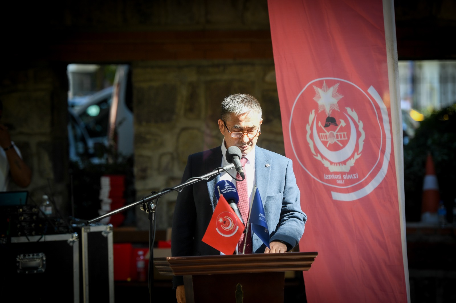 İzmir Büyükşehir Belediyesi İtfaiye Dairesi Başkanı Yaşar Korkmaz ise eski itfaiye binası olan Apikam’ın yalnızca taş duvarlardan oluşmadığını, yılların hatırasını, sayısız fedakarlığı ve mesleğin köklerini içerisinde barındırdığını söyledi. Yıllarca bu binada görev yaptığını belirten Korkmaz, “Sizlerle burada olmak benim için gurur ve heyecan verici. Bu avluda hem ömrünü mesleğe adamış, yangınlara ve afetlere karşı cesurca mücadele eden emekli büyüklerimiz hem de bu bayrağı devralmak için aramıza katılan genç kardeşlerimiz, arkadaşlarımız var. Büyüklerimiz bize yalnızca tecrübelerini değil, sabrı, cesareti ve dayanışmayı miras bıraktı. Gençler ise bu mirası geleceğe taşıyacak olan umudumuz. Bugün burada geçmiş ile geleceği, deneyimi ve heyecanı bir araya getiriyoruz. Hep birlikte bir kez daha itfaiyeciliğin sadece bir iş olmadığını, ömür boyu süren onurlu bir görev olduğunu yeniden hatırlıyoruz. Bizlere bu yolu açan görev sırasında hayatını kaybeden şehitlerimizi, ebediyete uğurladığımız büyüklerimizi, kahramanca mücadele eden gazilerimizi saygı ile anıyorum. Onların aziz hatırası daima bize yol gösterecek” şeklinde konuştu.