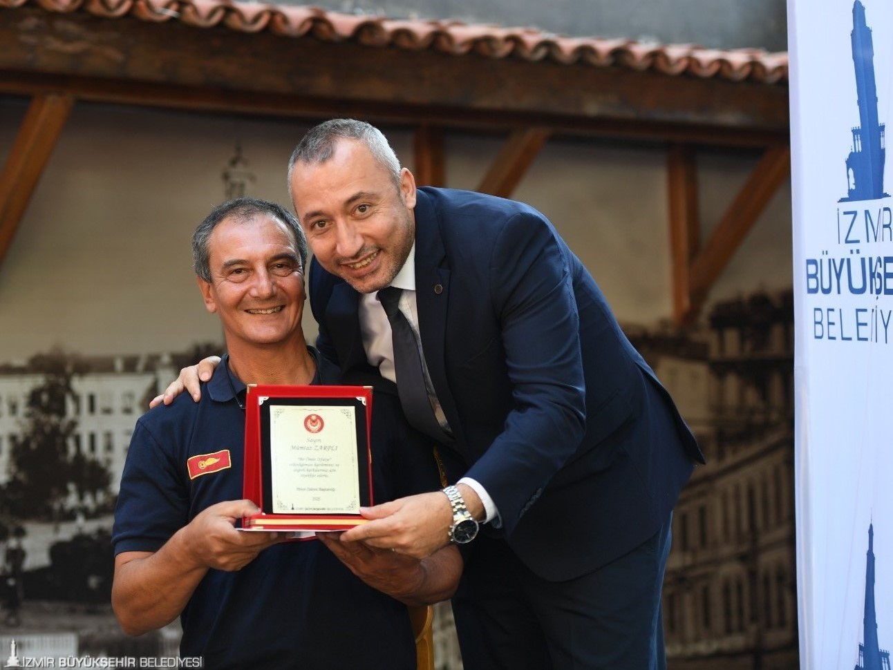 18 yıl önce yangın söndürme tüpü eğitimi sırasında, tüpün patlaması sonucu iki bacağını kaybeden ancak meslekten kopmayan engelli Mümtaz Zarplı da programa katıldı. Zarplı, “Emekli olan büyüklerimiz bu kuruma büyük emek verdi. Biz de bu bayrağı daha ileri taşımak için çalışıyoruz. Emanetçiyiz. Bizden sonraki nesillere, gençlere bayrağı teslim edeceğiz. Elimizden geldiği kadar İzmir halkına faydalı olmaya çalışıyoruz” dedi.