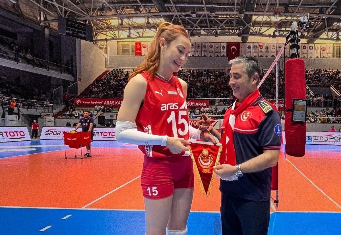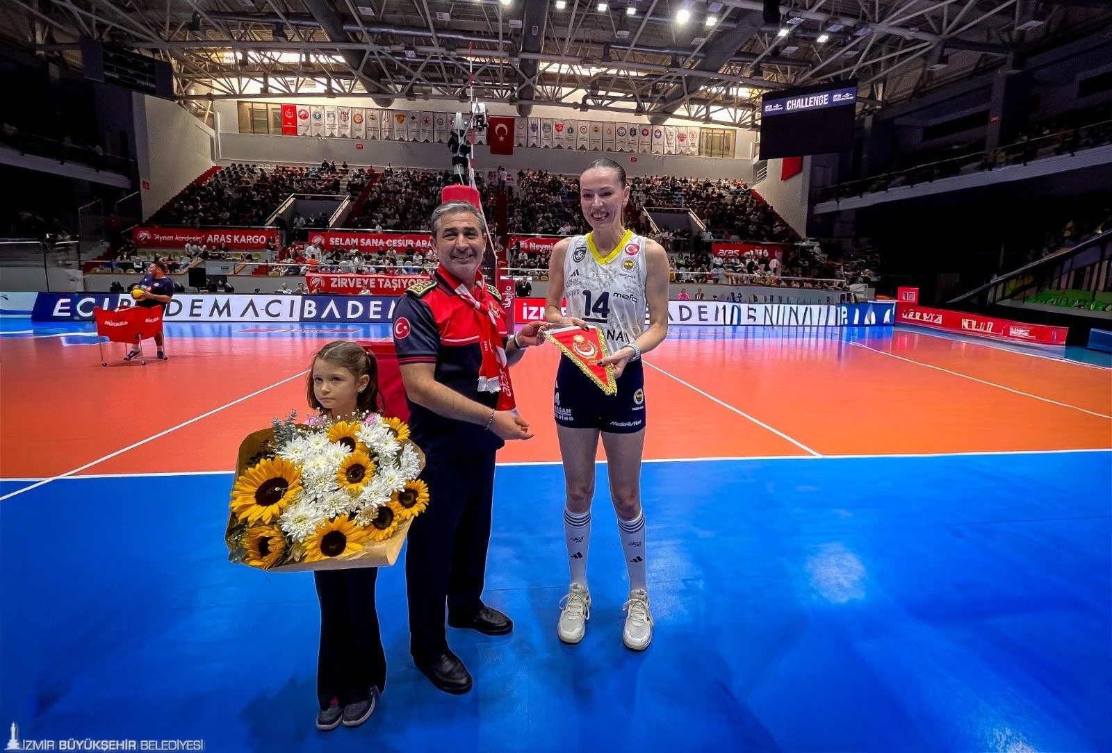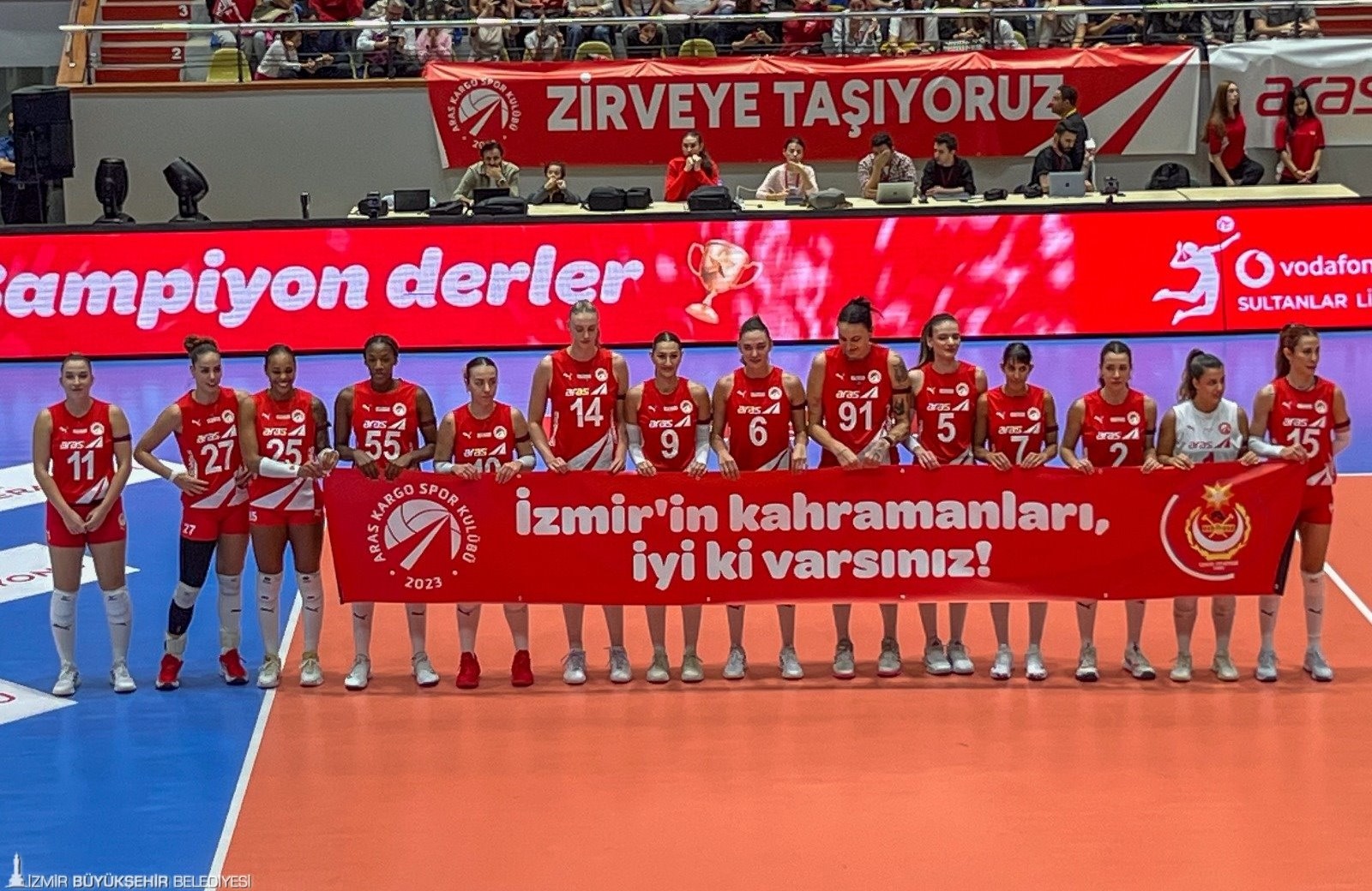 Vodafone Sultanlar Ligi’nde 2025-2026 sezonunun ilk haftası 12 Ekim’de oynanan karşılaşmalarla tamamlandı. Aras Spor Kulübü’nün Fenerbahçe Medicana ile karşı karşıya geldiği mücadele, Alsancak Atatürk Spor Salonu’nda yapıldı. Karşılaşma öncesinde Aras Spor Kulübü, yaz aylarında meydana gelen orman yangınlarında gösterdikleri özverili çalışmalar nedeniyle İzmir Büyükşehir Belediyesi İtfaiye Dairesi Başkanlığı’na anlamlı bir jestte bulundu. İtfaiye Dairesi Başkanı Yaşar Korkmaz ve beraberindeki itfaiye personeli, alkışlar eşliğinde sahaya davet edilerek plaketle onurlandırıldı. Plaketi, Aras Kargo Genel Müdürü ve Yönetim Kurulu Üyesi Utku Ayyarkın takdim etti. Ayrıca İtfaiye Dairesi Başkanı Yaşar Korkmaz, Türkiye A Milli Kadın Voleybol Takımı ve Fenerbahçe kaptanı Eda Erdem Dündar ile Aras Spor Kulübü kaptanı Hazal Selin Uygur’a İzmir İtfaiyesi’nin flamasını takdim ederek, iki takıma da başarılı bir sezon geçirmeleri temennisinde bulundu.