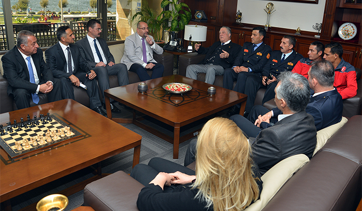 İzmir Büyükşehir Belediyesi’nin tüm kentlere örnek gösterilen İtfaiye teşkilatı, “İtfaiye Haftası” nedeniyle İzmir Büyükşehir Belediye Başkan Vekili Dr. Sırrı Aydoğan’ı makamında ziyaret etti. İzmir Büyükşehir Belediyesi Genel Sekreter Vekili Buğra Gökçe, Genel Sekreter Yardımcısı Barış Karcı, İtfaiye Daire Başkanı Serdar Yücel ve itfaiyecilerden oluşan heyet, çiçeklerle katıldıkları ziyarette gururlarını Başkan Vekili Dr. Aydoğan ile paylaştılar.
