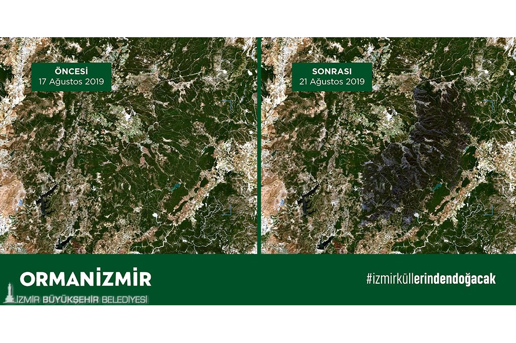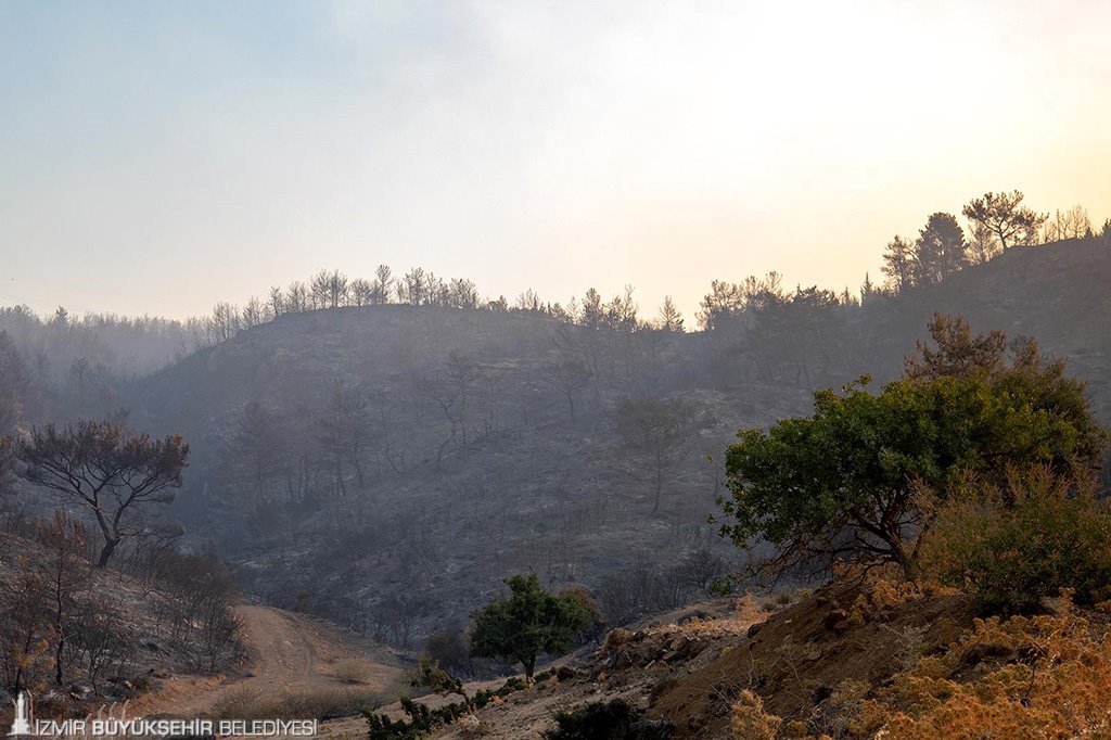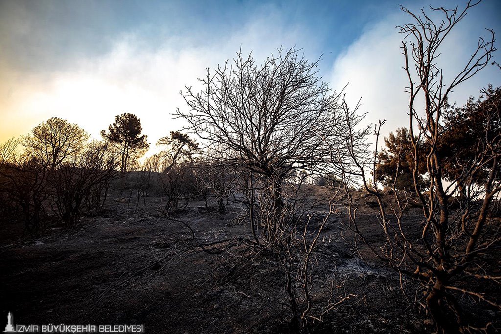 İzmir’in tarihinde gördüğü en büyük orman yangınlarından birinin vahim sonuçları belli olmaya başladı. TMMOB Ziraat Mühendisleri Odası İzmir Şubesi’nin, yangın sonrasında alandan elde edilen uydu verilerini esas alarak yaptığı hesaplamalara göre üç gün süren yangında 5 bin hektarlık bir orman alanı etkilendi. 5 bin hektarlık alanın 3 bin 500’ü ağır yanık sınıfında. Kalan yaklaşık 1500 hektarlık alanda ise ikinci dereceden yanma söz konusu. Yangın hattının kuzeyden güneye uzunluğu ise 15 kilometre olarak hesaplanıyor. Bu hesaplama, yaklaşık olarak İzmir’in Karşıyaka ilçesi kadar (5 bin 110 hektar) büyük bir alanın yandığı anlamına geliyor.Yanan orman alanının büyüklüğünü anlamak için ilçelerle yapılan bir kıyaslama, orman kaybının Balçova (2 bin 125 hektar), Bayraklı (3 bin 426 hektar) ve Narlıdere (4 bin 461 hektar) gibi ilçelerin yüzölçümlerinden daha fazla olduğunu gözler önüne serdi. Yaşanan felaket sonucunda yaklaşık iki Balçova ilçesi veya Karşıyaka büyüklüğünde bir orman alanın yandığı ortaya çıktı.