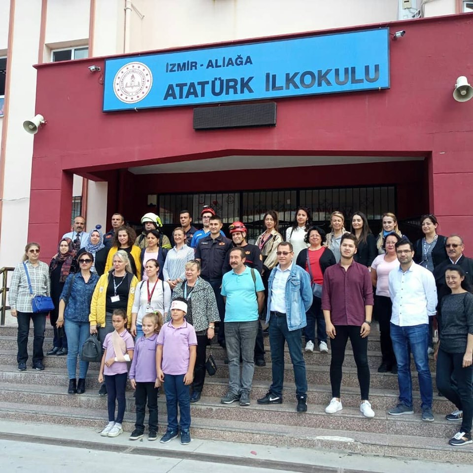 Aliağa Atatürk İlköğretim Okulu'nda yangında bina tahliyesi, yangın söndürme ve kurtarma tatbikatı gerçekleştirildi.