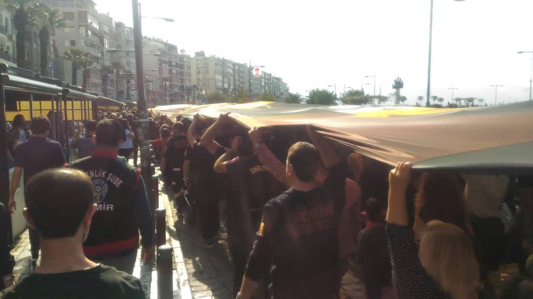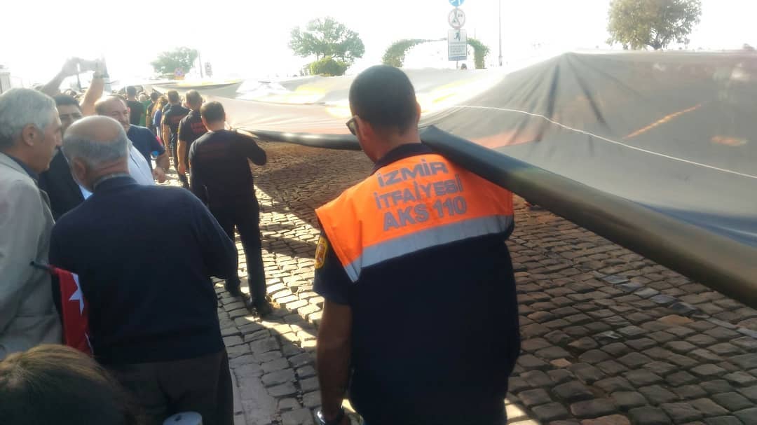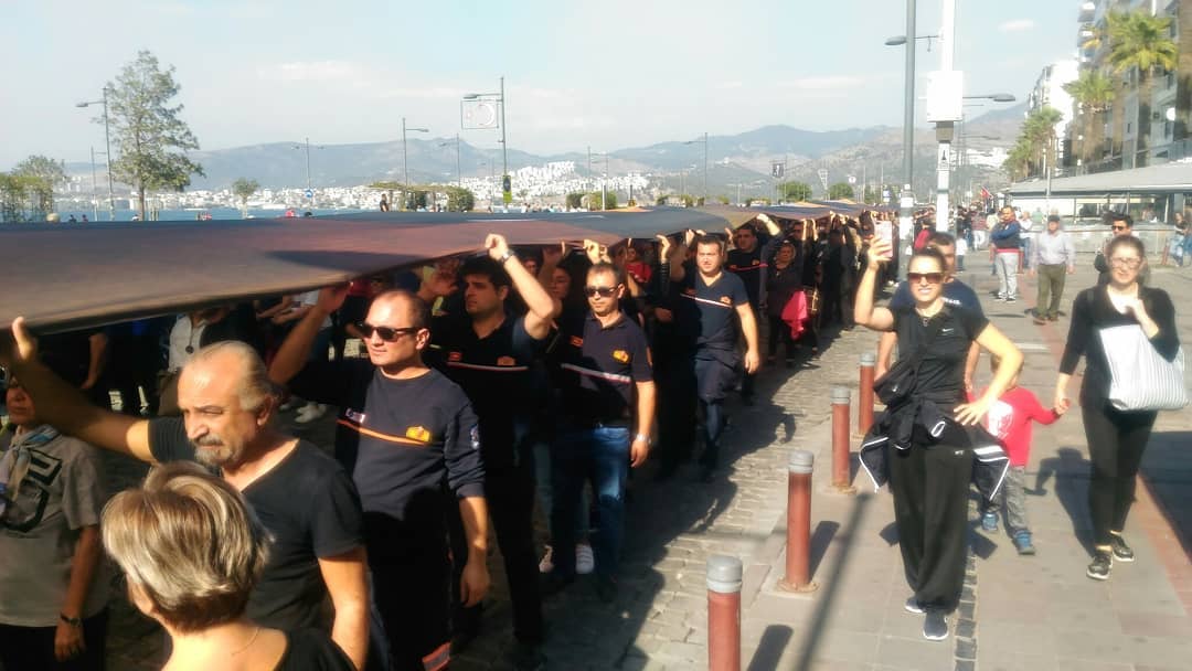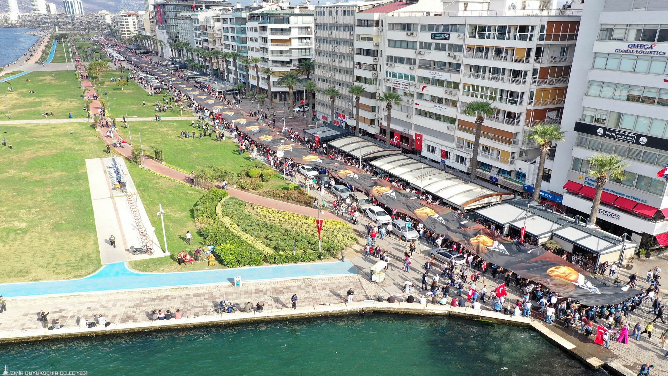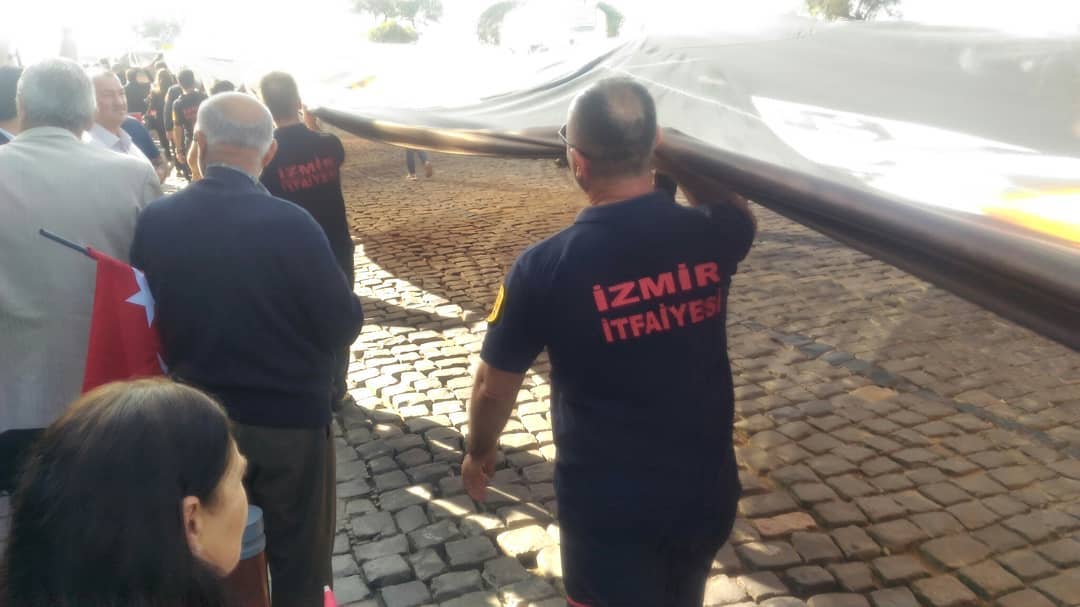 Ulu Önder Mustafa Kemal Atatürk 81'inci ölüm yıldönümünde, İzmir Büyükşehir Belediyesi tarafından düzenlenen "Ata'ya Saygı Yürüyüşü"yle anıldı. Binlerce İzmirli ile Ateş Savaşçıları, 350 metre uzunluğundaki dev posteri Alsancak Limanı’ndan Cumhuriyet Meydanı’na kadar birlikte taşıdı.İzmir Büyükşehir Belediyesi, Türkiye Cumhuriyeti'nin kurucusu Mustafa Kemal Atatürk'ün 81'inci ölüm yıldönümünde, "Ata'ya Saygı Yürüyüşü" düzenledi. İzmir Büyükşehir Belediye Başkanı Tunç Soyer'in de katıldığı kortejde, binlerce kişi 350 metrelik Atatürk posterini Alsancak Limanı'ndan Cumhuriyet Meydanı'na kadar taşıdı. Bayrak kortejinin arkasında, marşlar çalarak yürüyüşe katılan İzmir Büyükşehir Belediye bandosuna vatandaşların ilgisi büyük oldu.