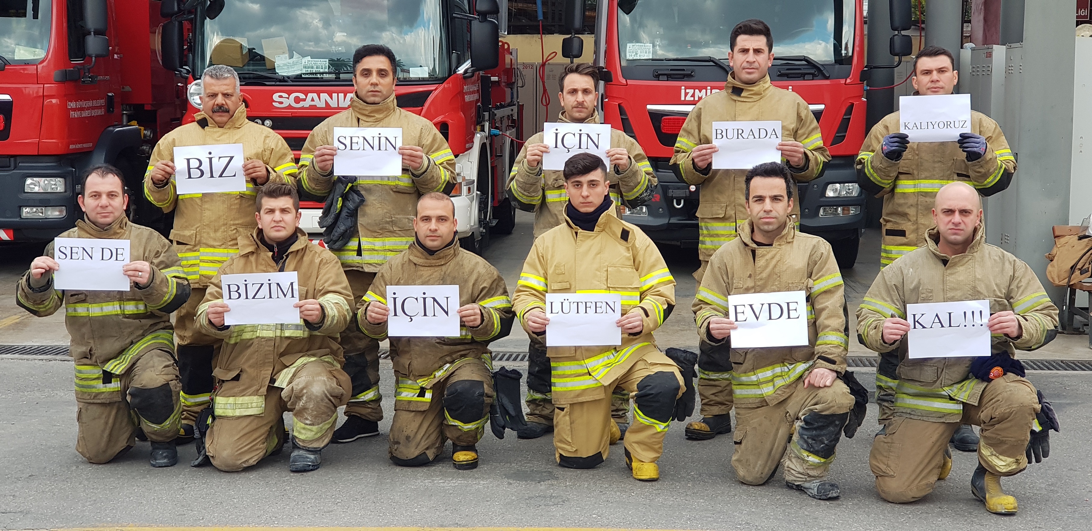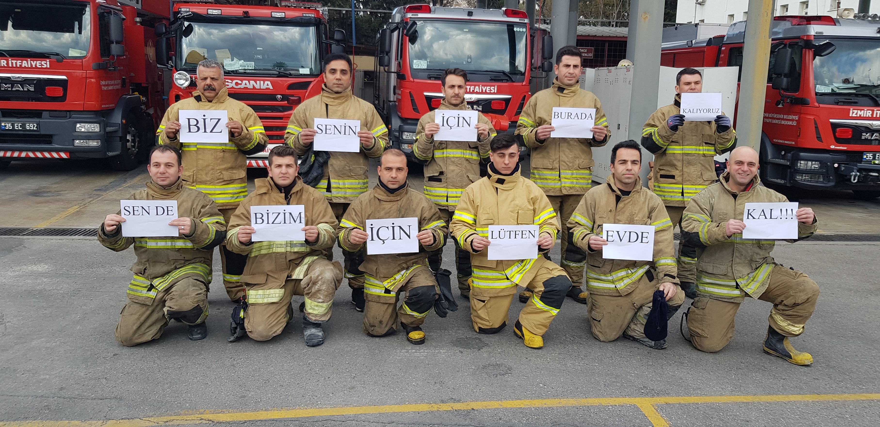Ellerindeki pankartlarla "Biz senin için burada kalıyoruz/Sen de bizim için lütfen evde kal" mesajını oluşturan ateş savaşçıları, İzmirlilerden mecbur kalmadıkları sürece dışarı çıkmamalarını, evlerinde kalmalarını istedi. Ataş savaşçıları, "Biz itfaiyeciler, sağlıkçılar, emniyet mensupları, askerlerimiz sizler için 7/24 görev başındayız. Toplum olarak sorumluluk almamız gereken bu günlerde lütfen sizler de evinizde kalın"şeklinde konuştular.