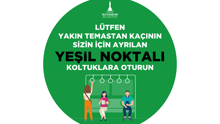 Yeşil koltuk uygulaması ve alınan önlemlerle ilgili bilgilendirici yazılar da hazırlayan Büyükşehir Belediyesi, metro, tramvay, gemi, tren ve otobüslerle aktarma merkezlerine, iskelelere, istasyonlara ve duraklara bu yazıları astı. Yan yana ve arka arkaya oturmayı engelleyen yeşil koltuk uygulamasında, ‘Lütfen yakın temastan kaçının. Sizin için ayrılan yeşil noktalı koltuklara oturun’ mesajı veriliyor.