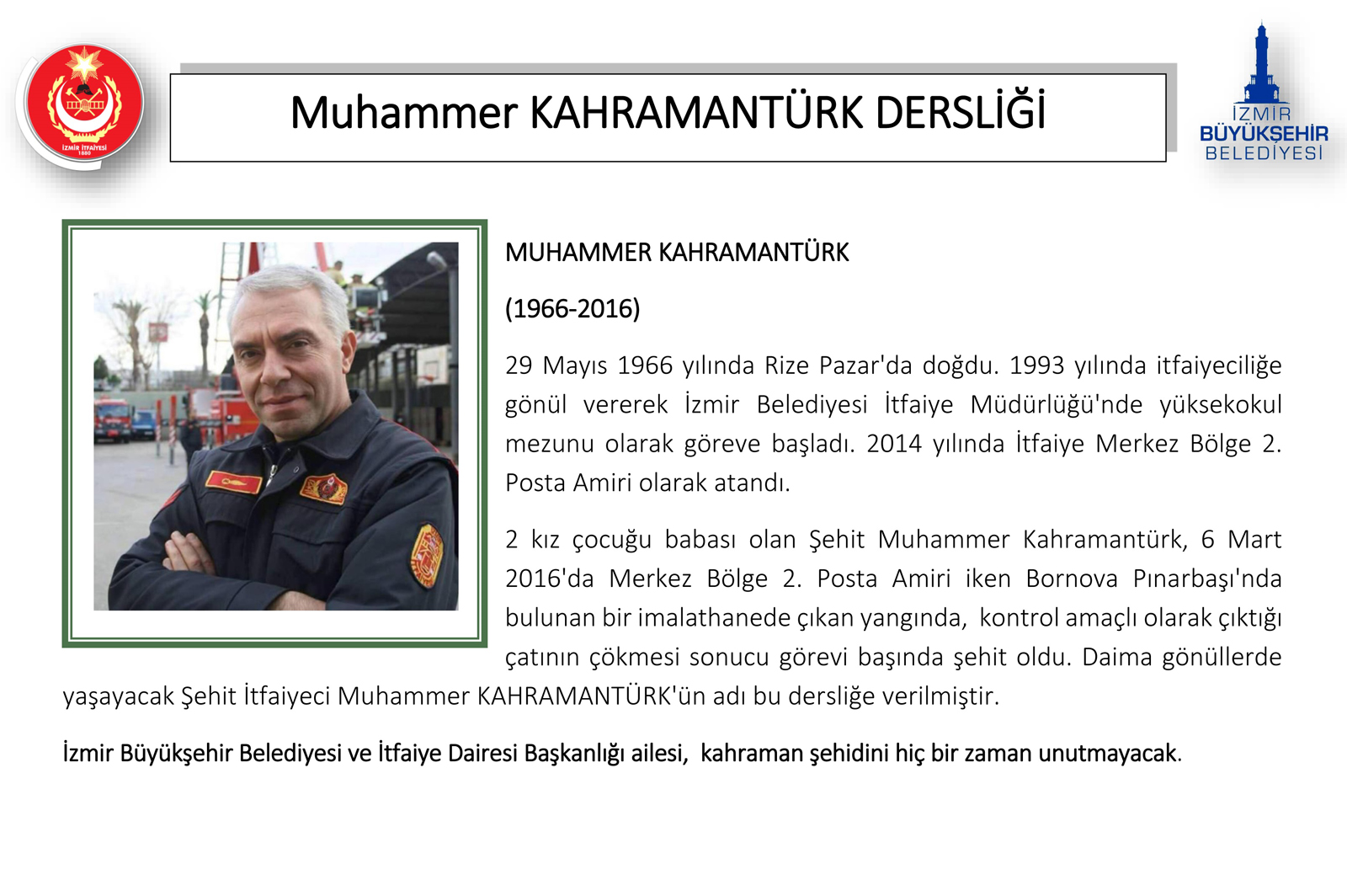 İzmir Büyükşehir Belediyesi İtfaiyesi, ateş savaşçılarının haftasında şehitlerini unutmadı.Görevleri başında şehit olan Muhammer Kahramantürk ve Ozan Avşar kabirleri başında anıldı, Buca Toros'taki Doğal Afet ve Arama Kurtarma Eğitim Merkezi'nde bulunan iki dersliğe isimleri verildi.