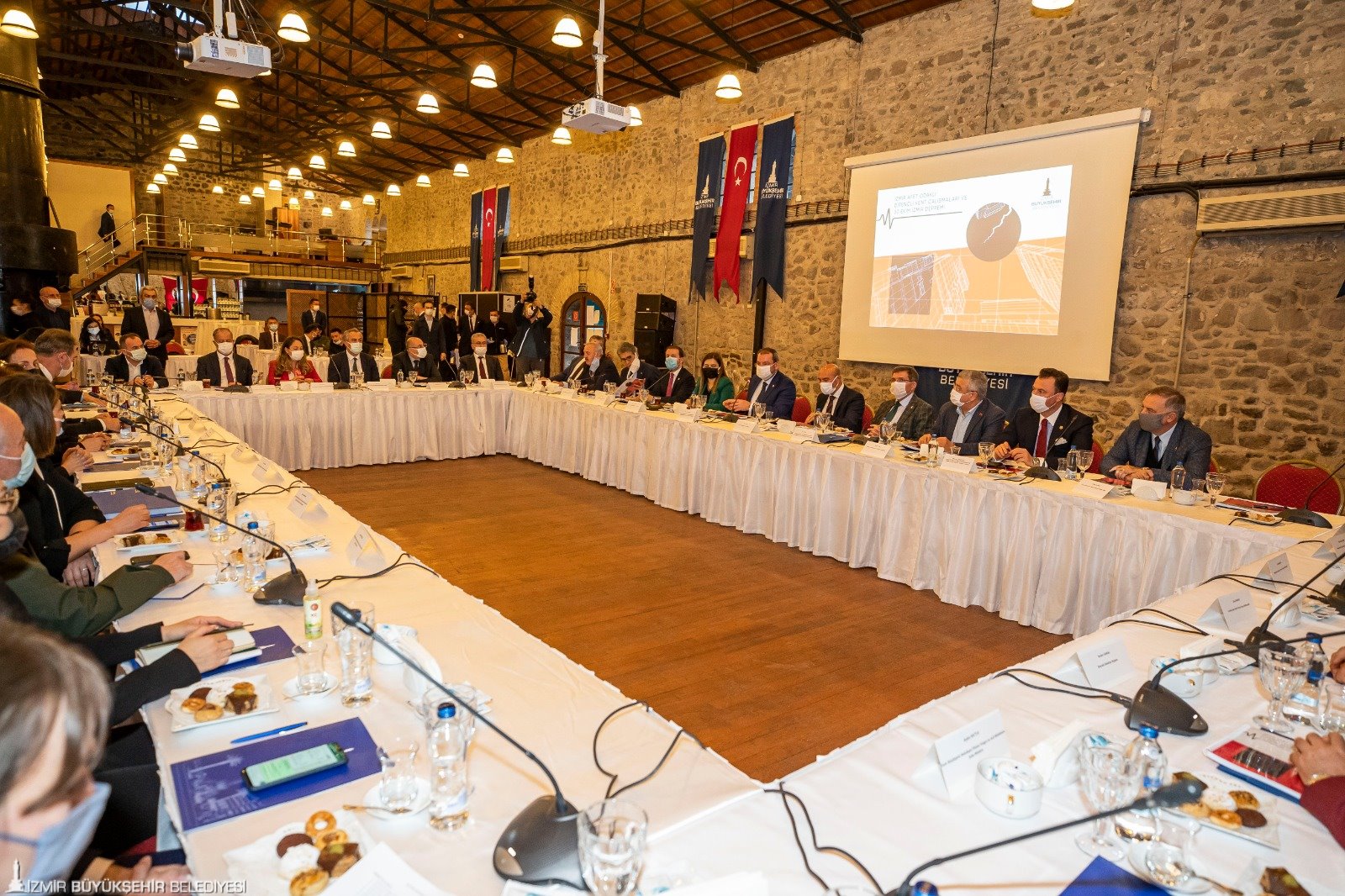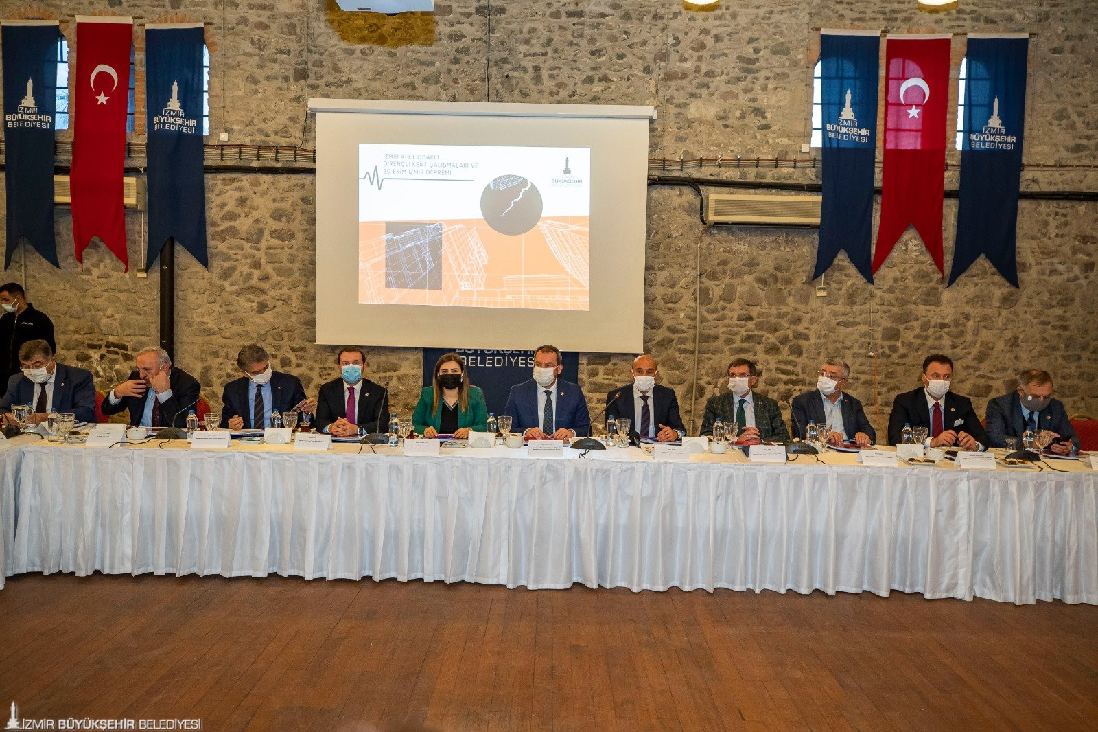 Ardından Tarihi Havagazı Fabrikası Kültür Merkezi’nde Komisyon heyetine İzmir Büyükşehir Belediyesi’nin afet odaklı dirençli kent çalışmalarıyla ilgili kapsamlı bir sunum yapıldı. İzmir Büyükşehir Belediyesi Genel Sekreteri Dr. Buğra Gökçe deprem sırasında yapılanları, deprem sonrası çalışmaları ve imar plan düzenlemeleri konusunda bilgi verdi. İzmir Büyükşehir Belediyesi İtfaiye Dairesi Başkanı İsmail Derse 30 Ekim depreminin hemen ardından arama kurtarma ve depremzedeler için çadır alanlarının kurulmasıyla ilgili yapılan çalışmalar konusunda bilgi aktarırken, İzmir Büyükşehir Belediyesi Genel Sekreter Yardımcısı Ertuğrul Tugay deprem mağdurlarına yönelik sosyal destekler ve dayanışma kampanyaları hakkında bir sunum yaptı. Genel Sekreter Yardımcısı Suphi Şahin ise İzmir'deki kentsel yenileme çalışmaları, deprem öncesi yapılan afet odaklı çalışmalar, mevzuata yönelik tespit ve öneriler hakkında bilgi verdi. İzmir Büyükşehir Belediyesi Meclisi'nden oybirliğiyle çıkan ve 30 Ekim depreminin ardından ağır ve orta hasarlı olarak tespit edilen ruhsatlı yapılar ile 1998 öncesinde ruhsat alanlar veya 6306 sayılı kanun kapsamında riskli olarak belirlenen ruhsatlı yapıları kapsayan yeni düzenlemeyle ilgili sunum da yapan Suphi Şahin, "Yeni düzenlemeyle dönüşümde hak kayıplarının önüne geçilmesi amaçlandı" dedi.