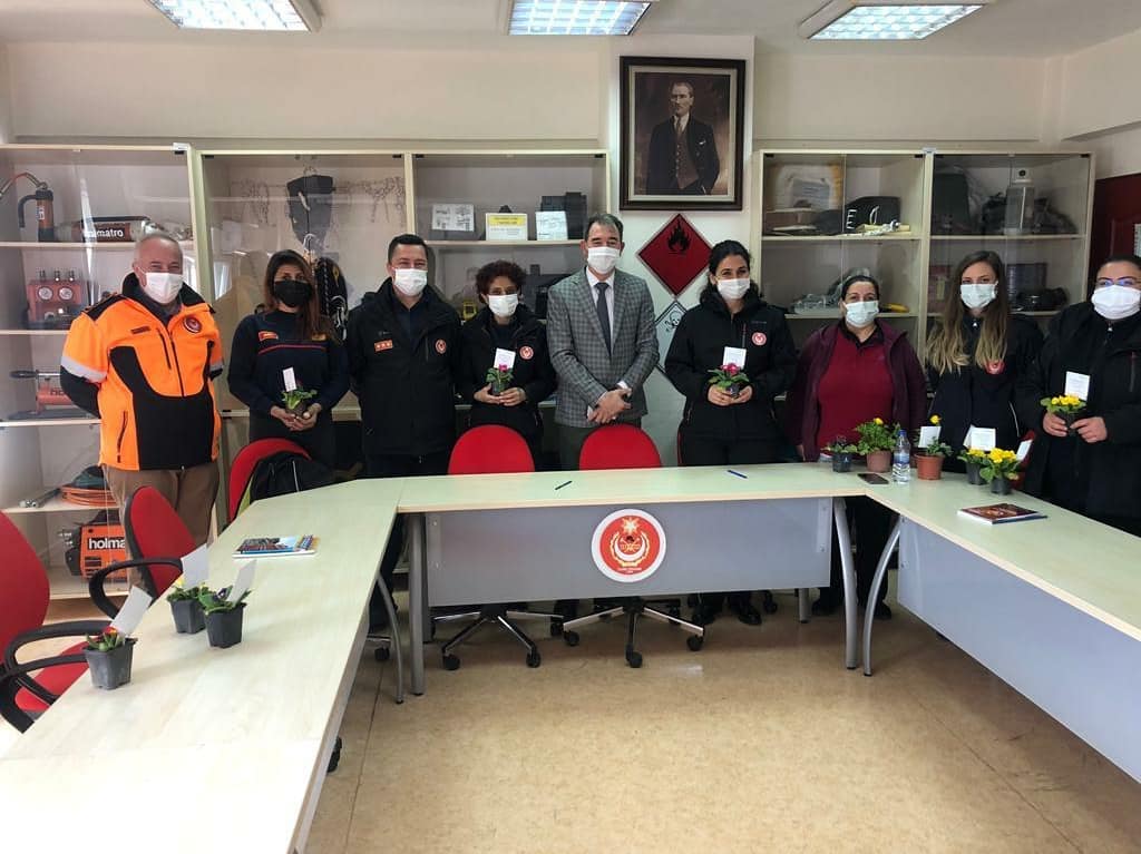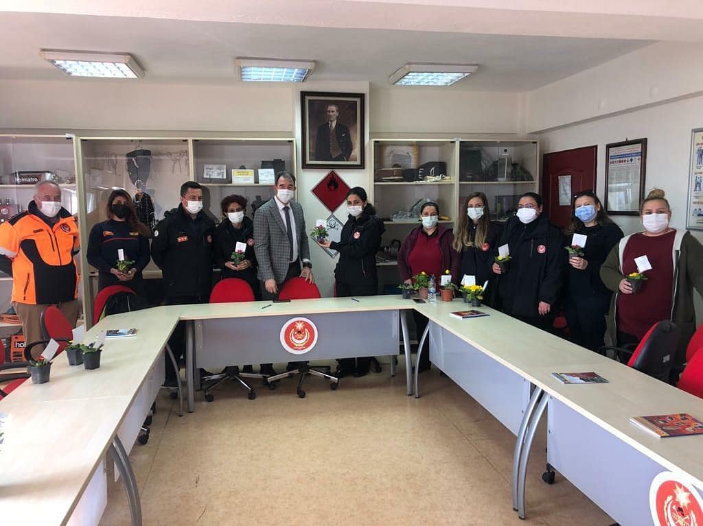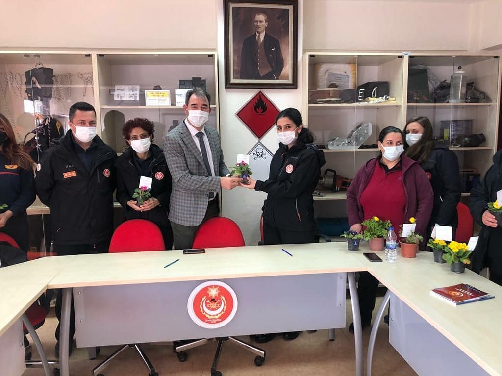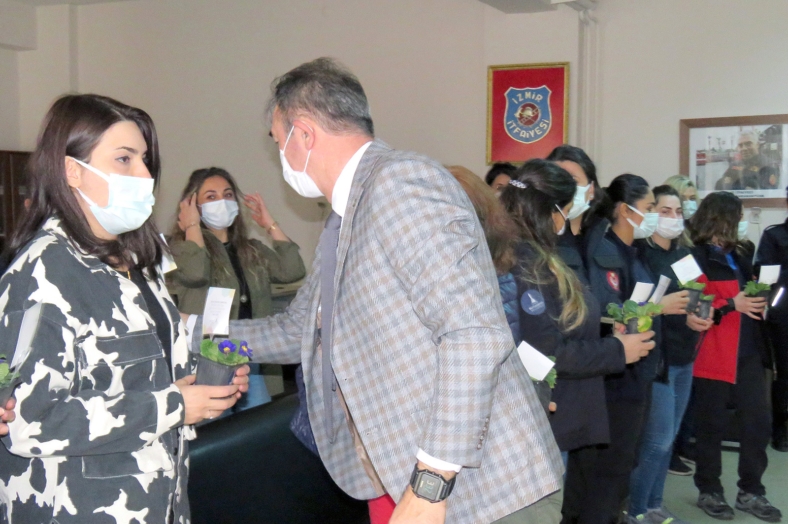 Başkan Soyer'in selamı ile birlikte çiçkleri dağıtan İzmir İtfaiye Dairesi Başkanı İsmail Derse ile Yangın ve Acil Müdahale Şube Müdürü Aydın Mutlu, kadın ateş savaşçılarına özverili çalışmalarından dolayı teşekkür etti.