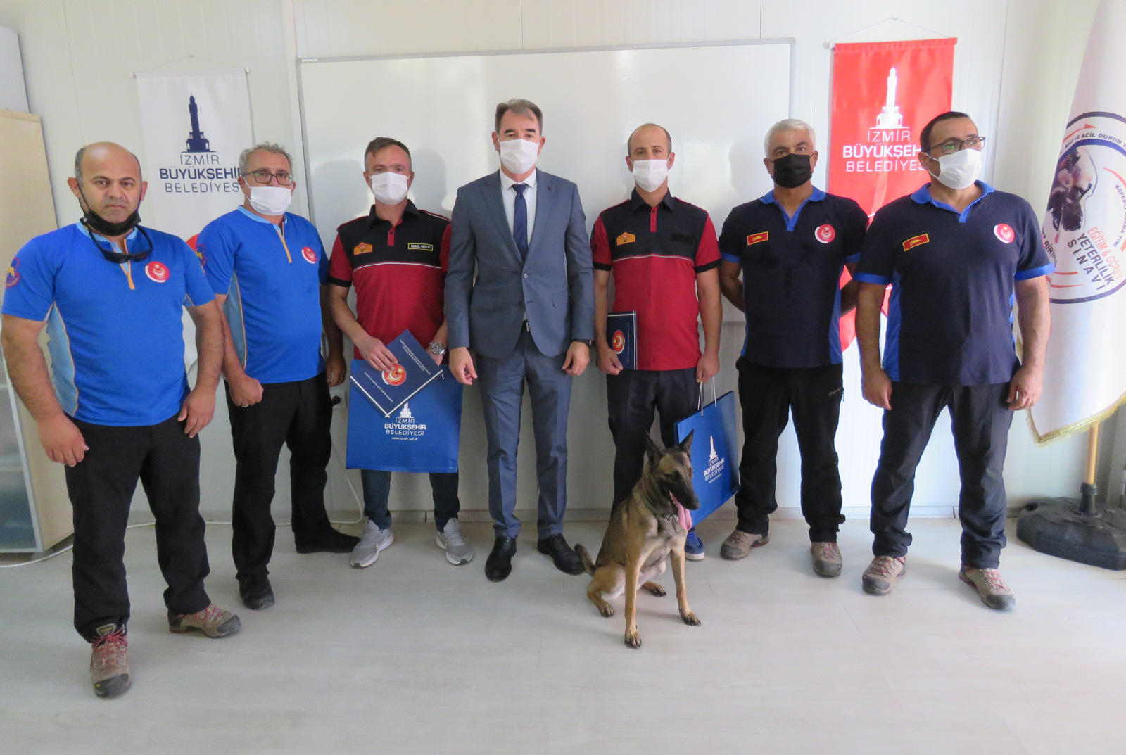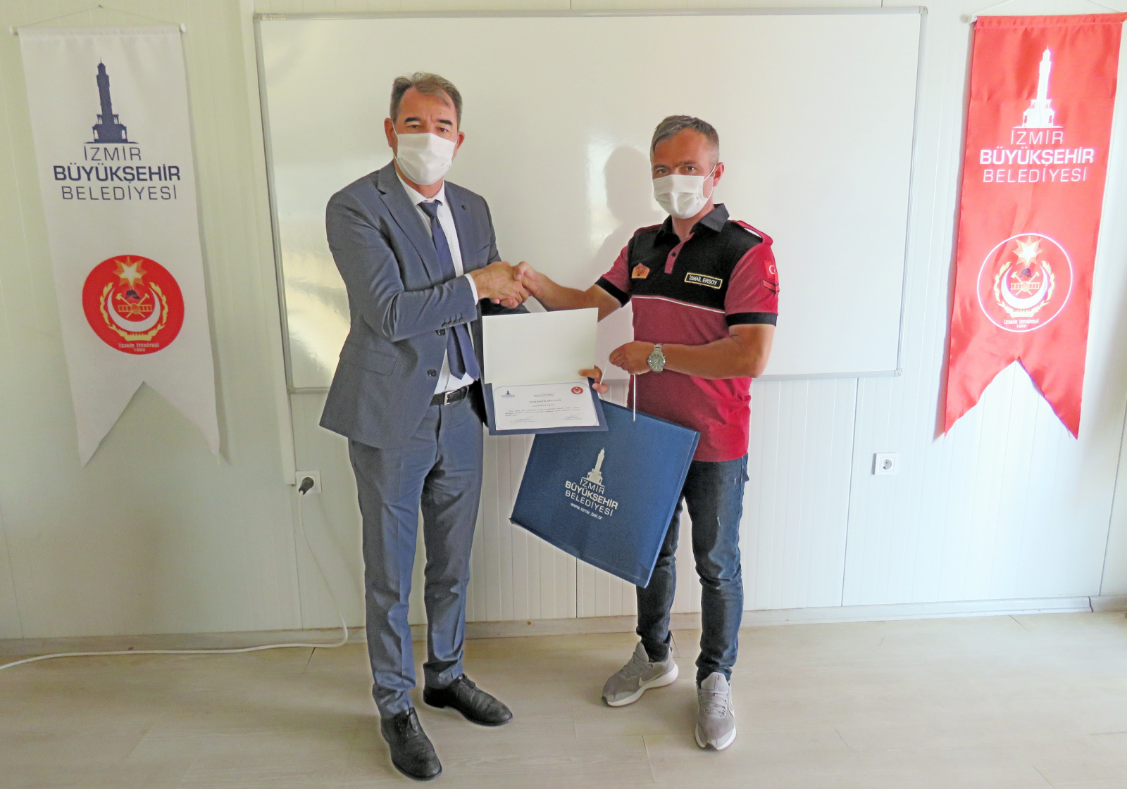 Arama Kurtarma Köpek Eğitimi için gelen Trabzon İtfaiyesi personeli katılım ve teşekkür belgelerini İzmir Büyükşehir İzmir İtfaiyesi Dairesi Başkanı İsmail Derse'den aldılar.