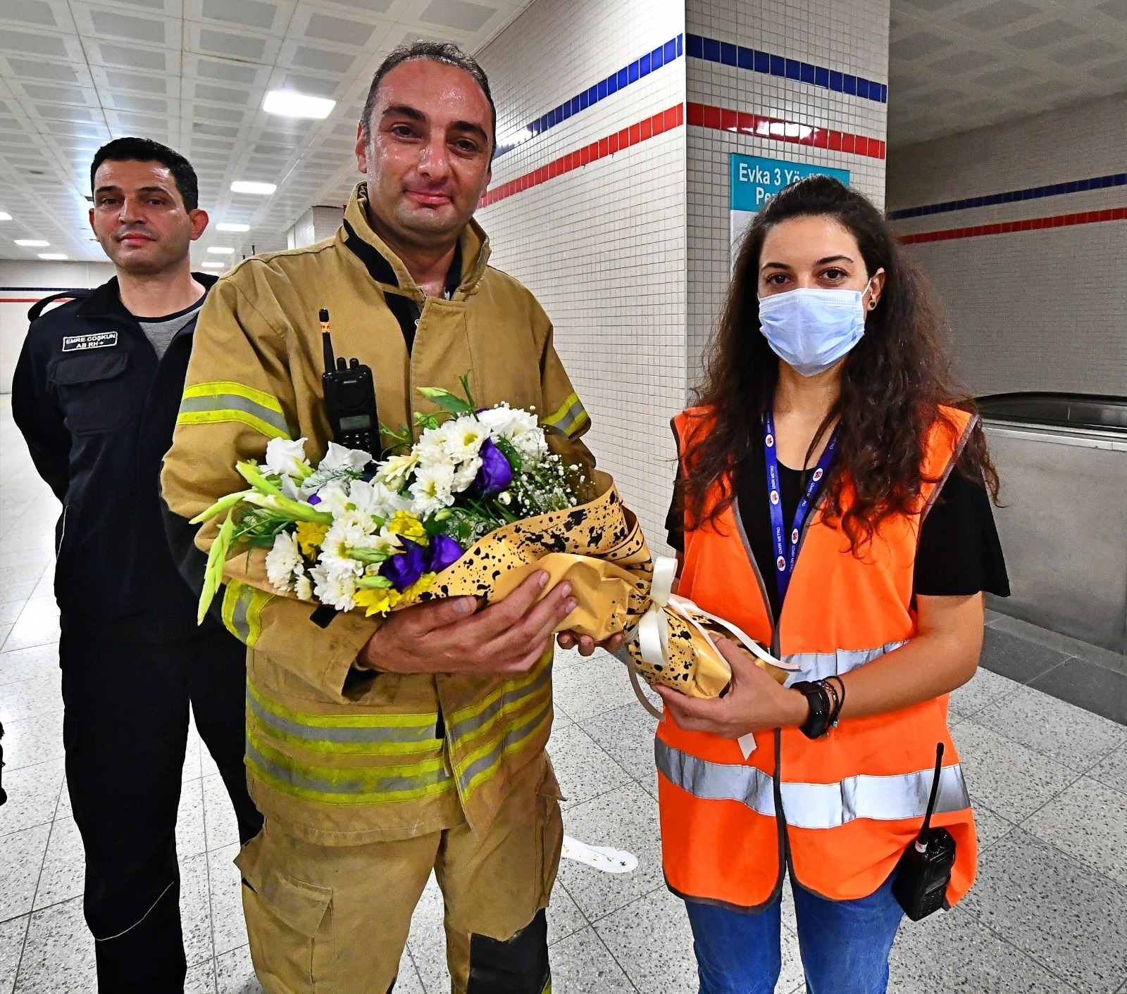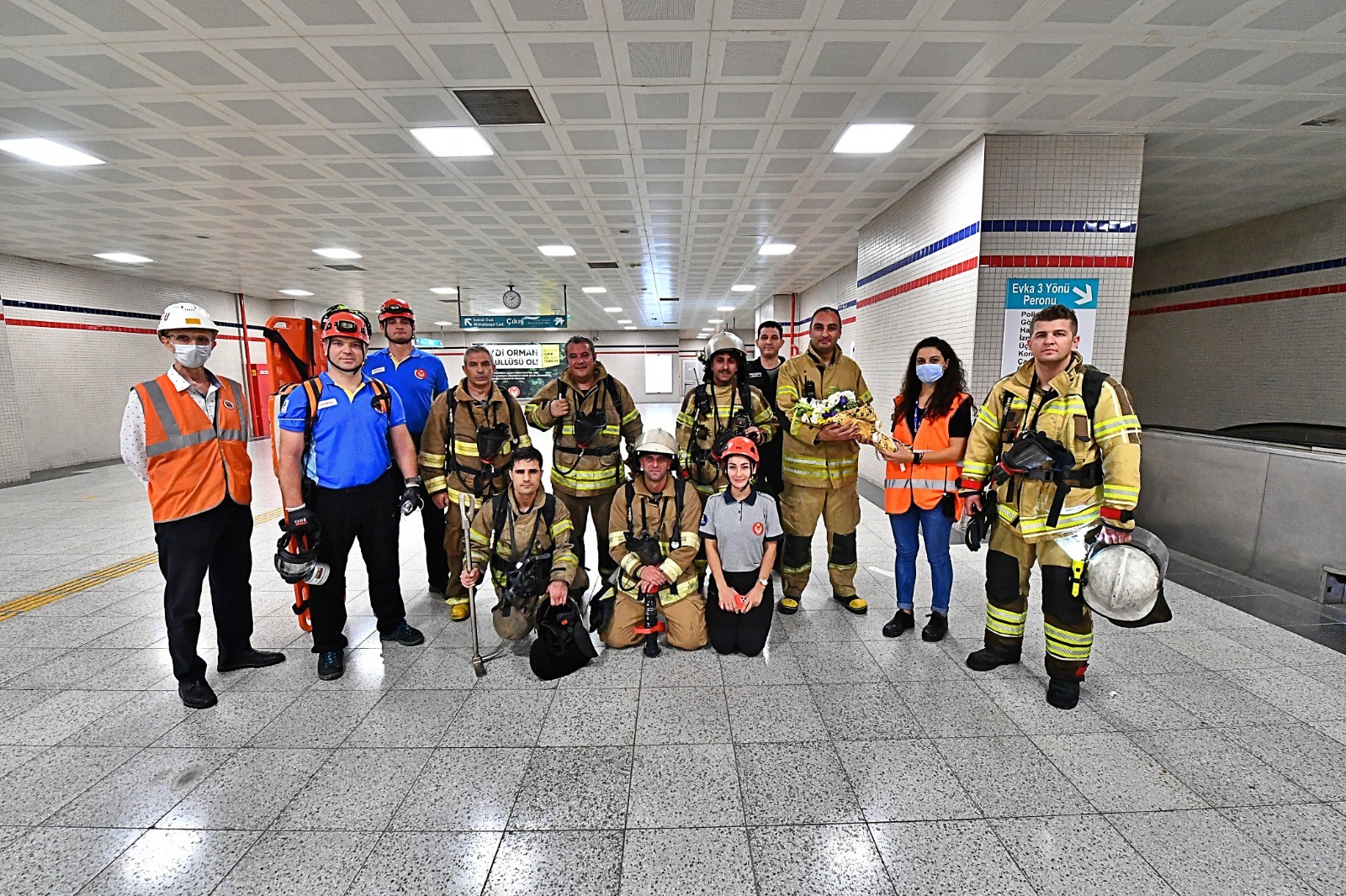 İzmir Metrosu yetkilileri, gece yarısından sonra yapılan tatbikatın ardından itfaiye ekiplerine çiçek verdi.
