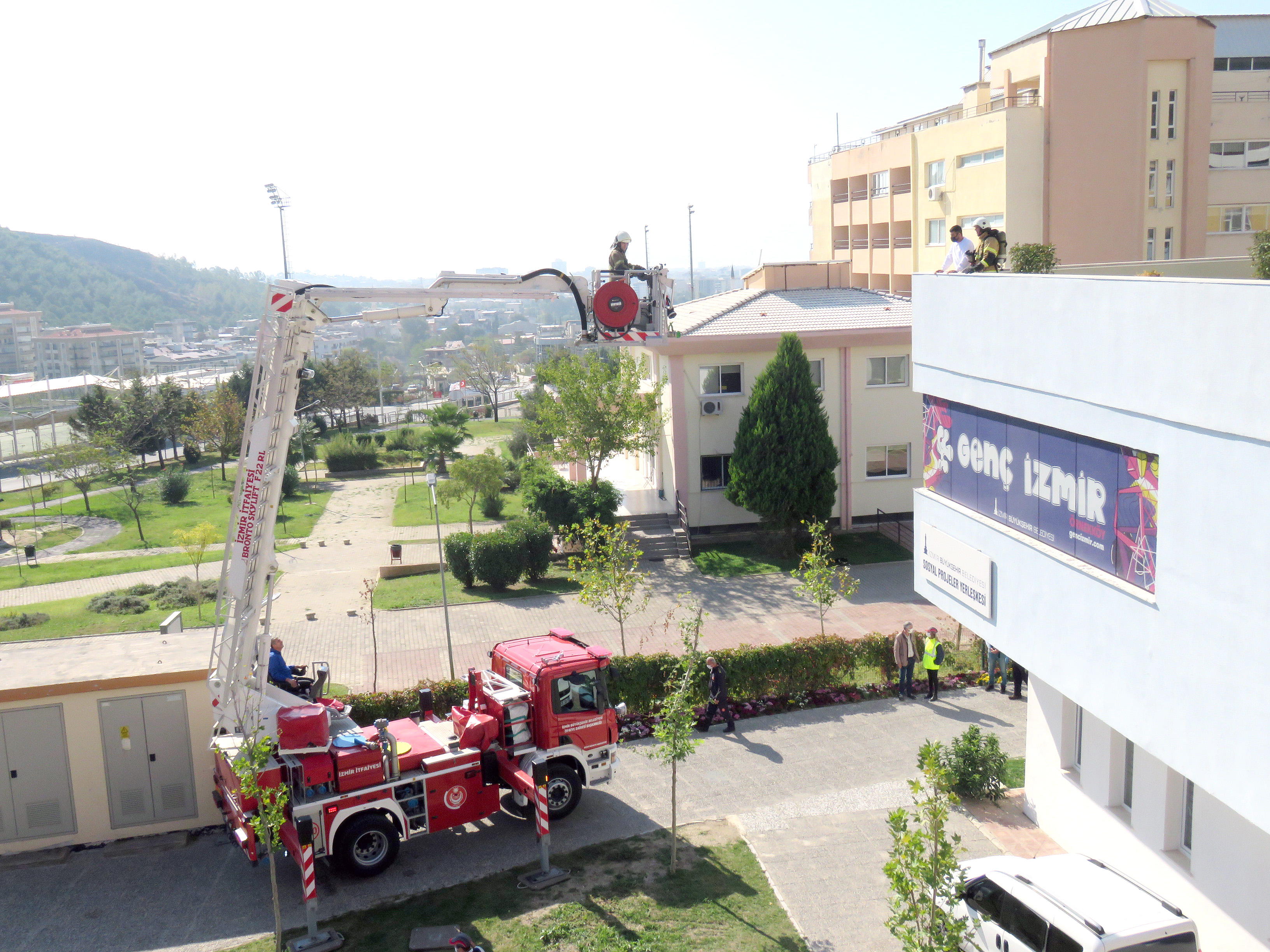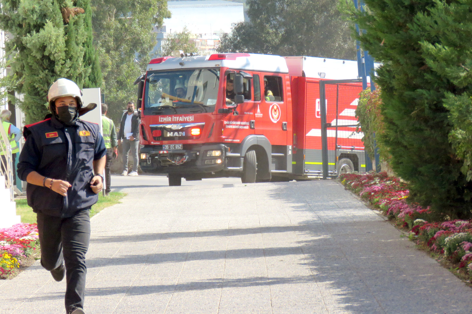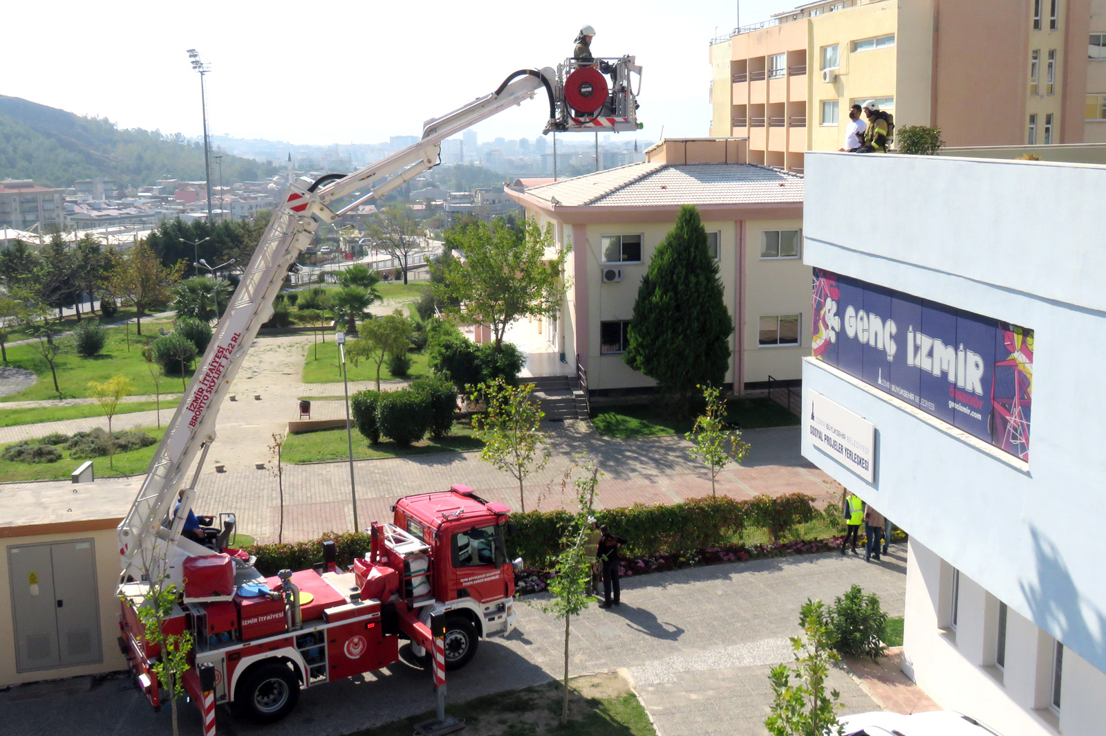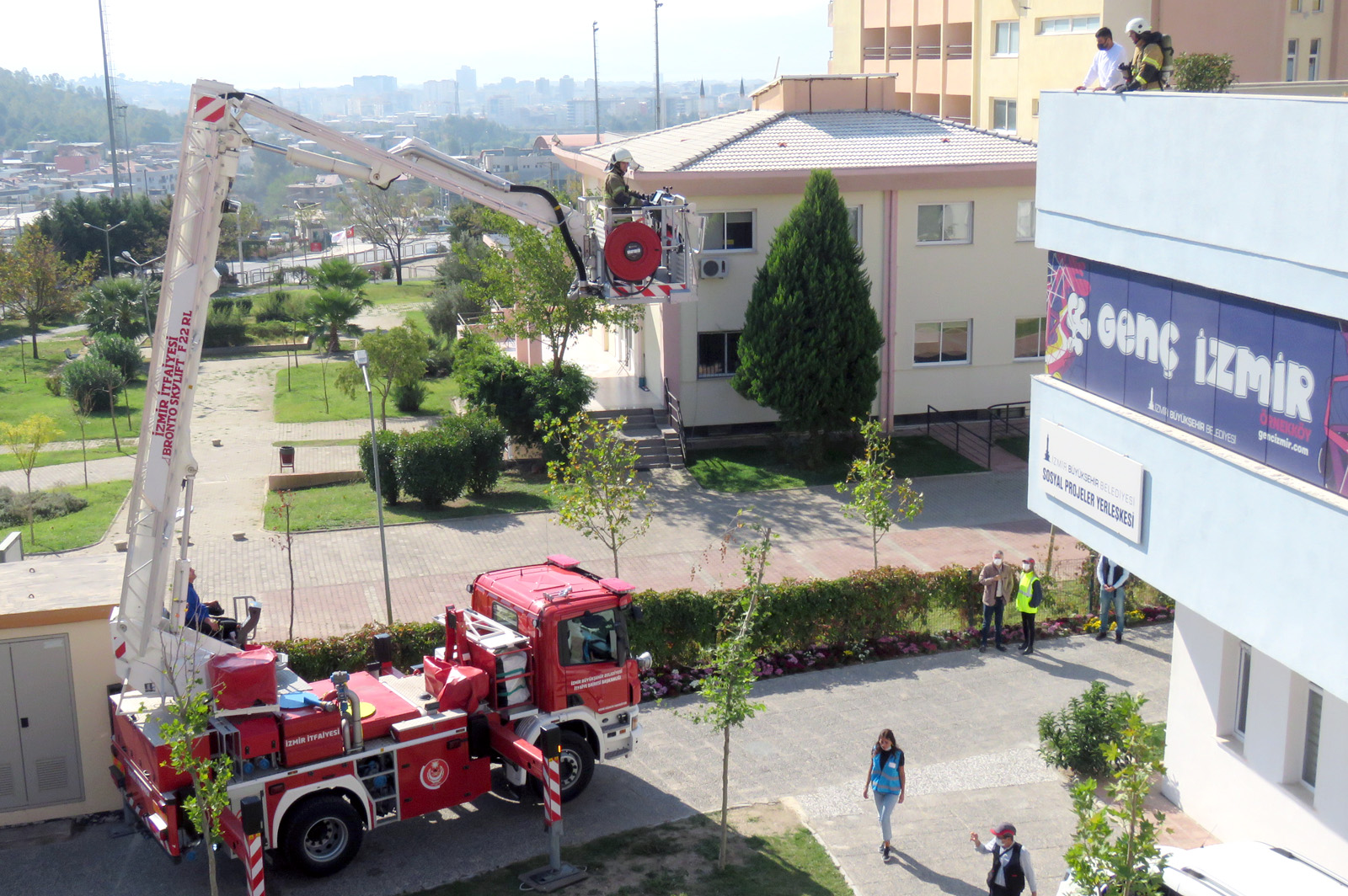 İzmir İtfaiyesi, Örnekköy'deki İzmir Büyükşehir Belediyesi Sosyal Projeler Yerleşkesinde, yangın söndürme ve kurtarma tatbikatı düzenledi.