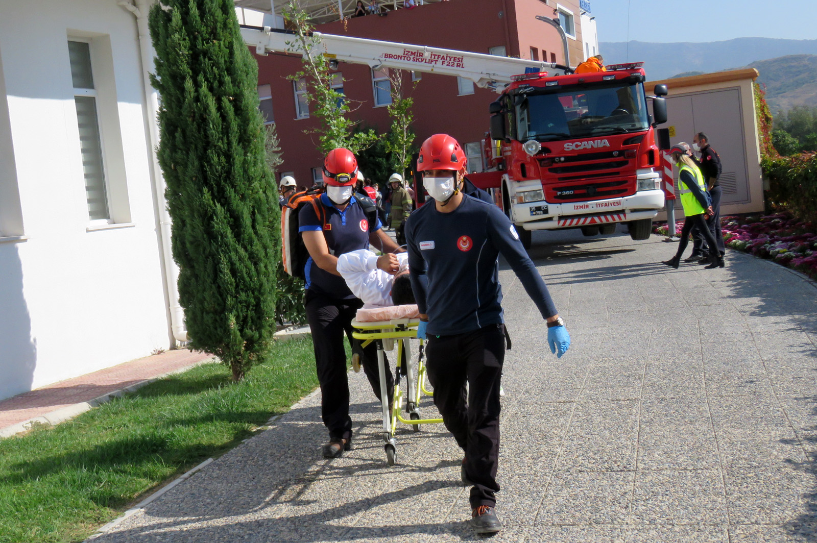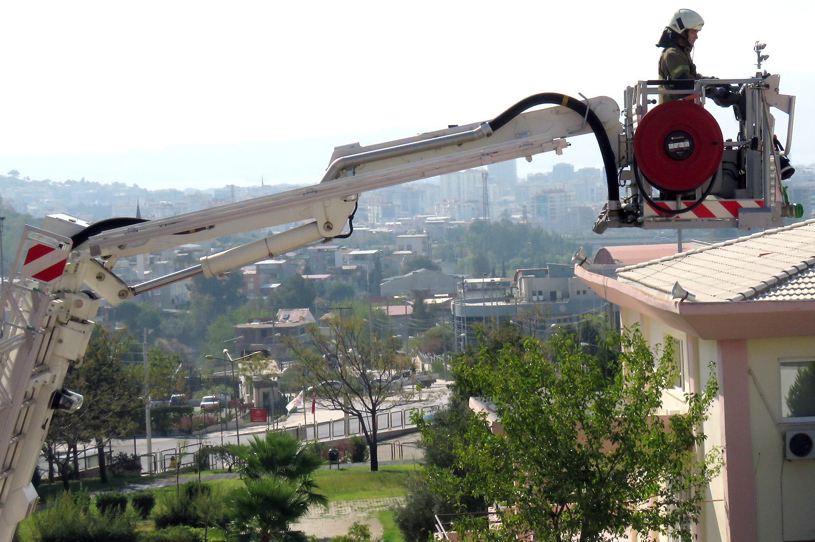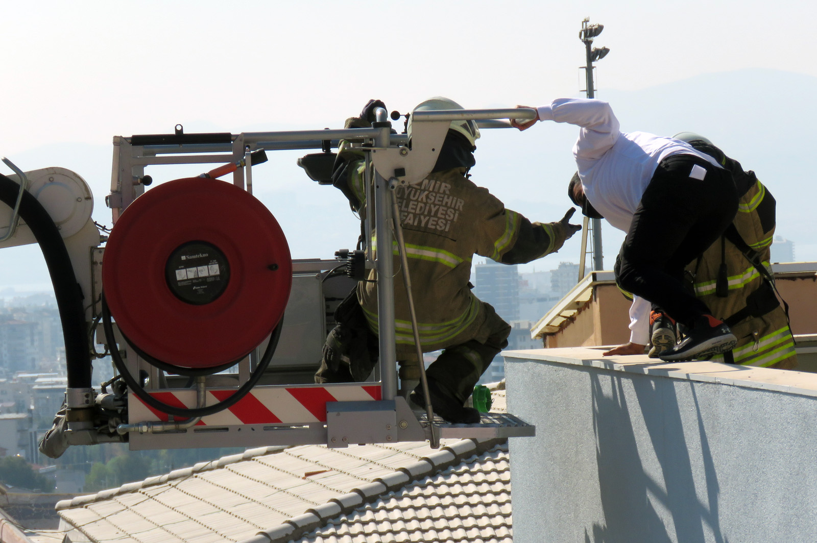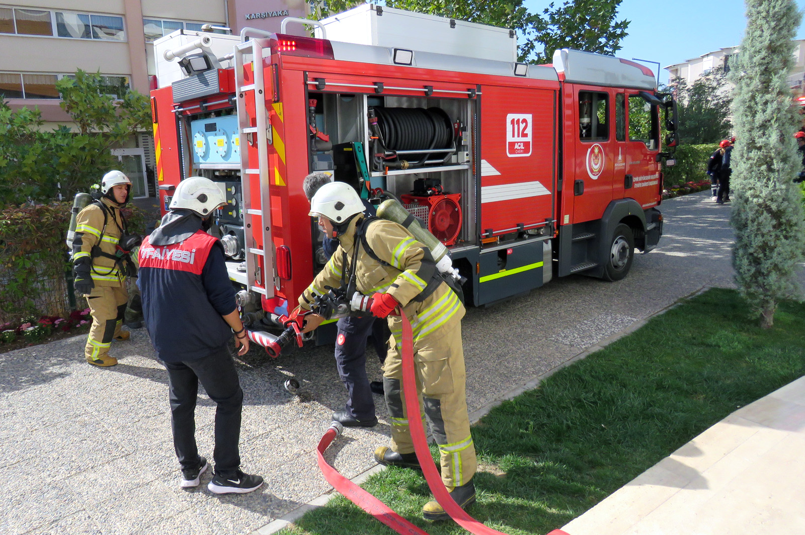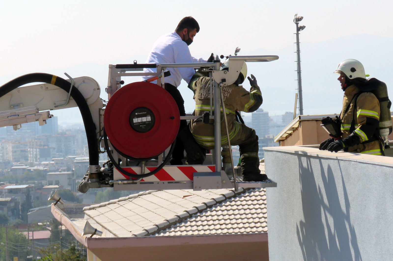 İzmir İtfaiyesi, Örnekköy'deki İzmir Büyükşehir Belediyesi Sosyal Projeler Yerleşkesinde, yangın söndürme ve kurtarma tatbikatı düzenledi.