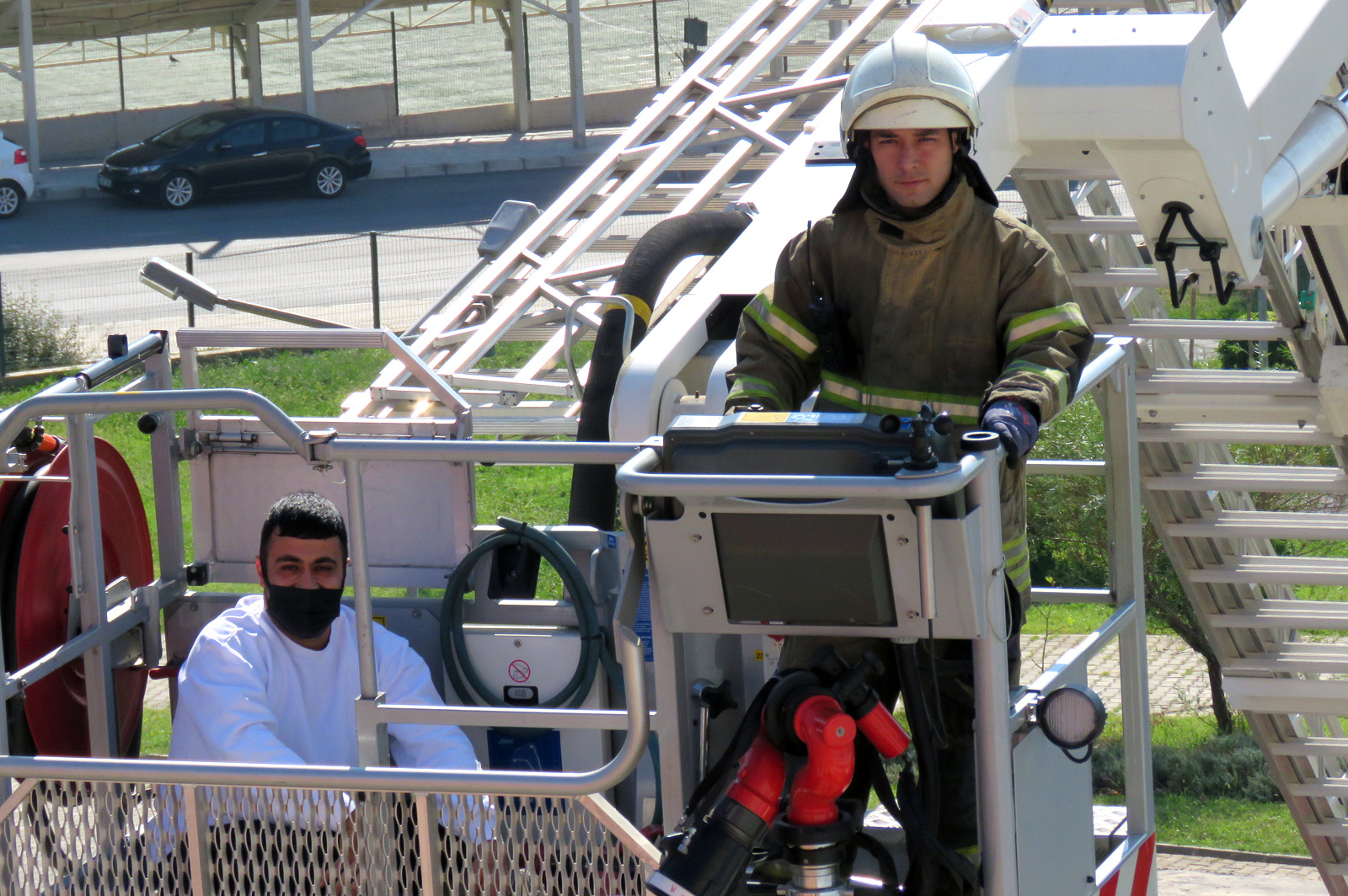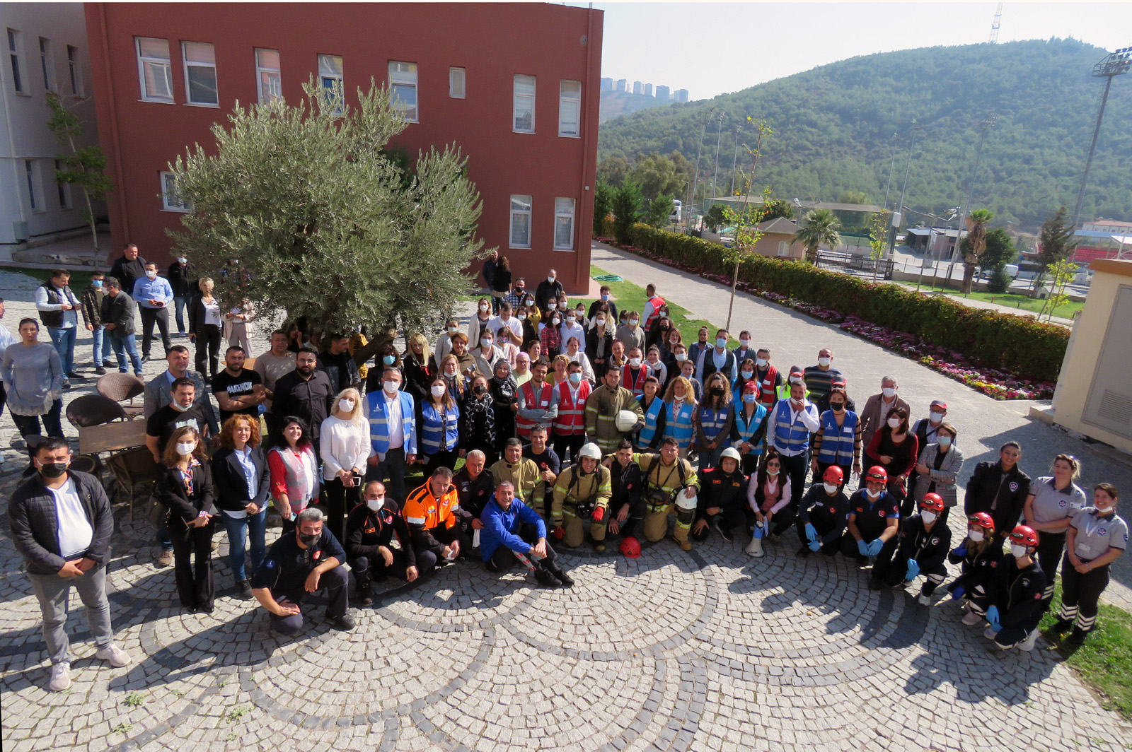 Yerleşke çalışanlarınca takdir edilen ve alkışlanan İzmir İtfaiyecileri, tatbikat sonrası bir arada fotoğraf çektirdiler.