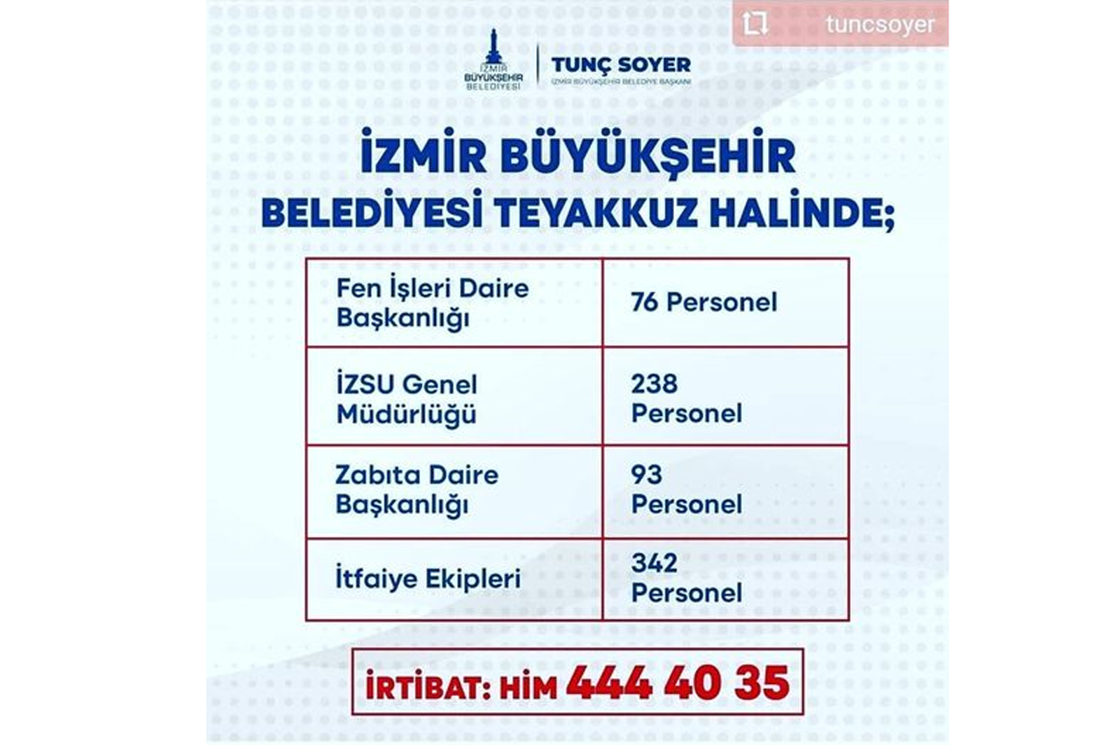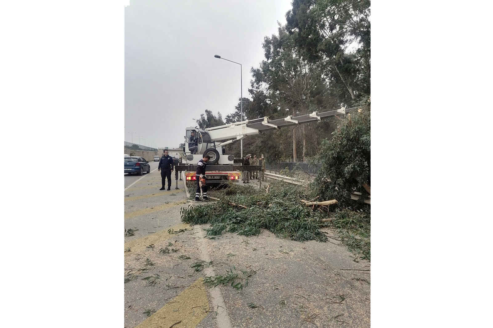 İzmir'de kuvvetli fırtına nedeniyle Büyükşehir Belediyesi ekipleri yoğun mesai harcadı. Fırtına, kent genelinde 33 ağacın zarar görmesine, Menderes, Tire, Karaburun ve Foça’da çatıların uçmasına neden oldu. İzmir Büyükşehir Belediyesi ekipleri yaşanan olumsuzluklara anında müdahale etti.