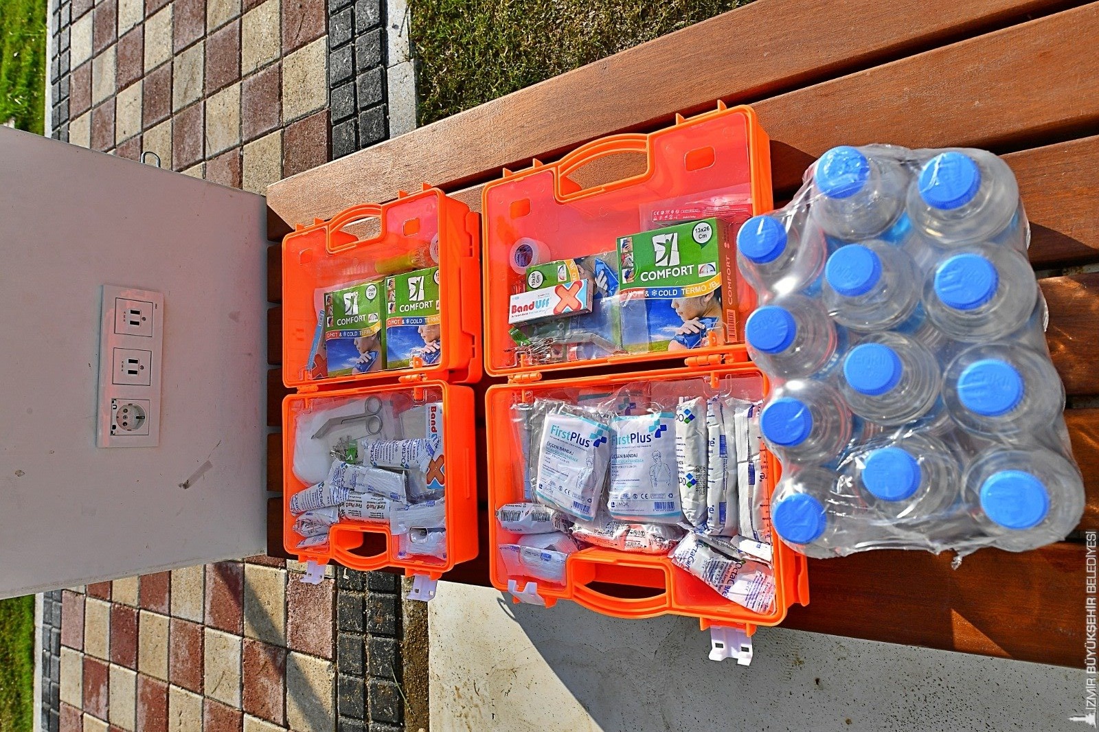 Su, sağlık çantası ve battaniye var