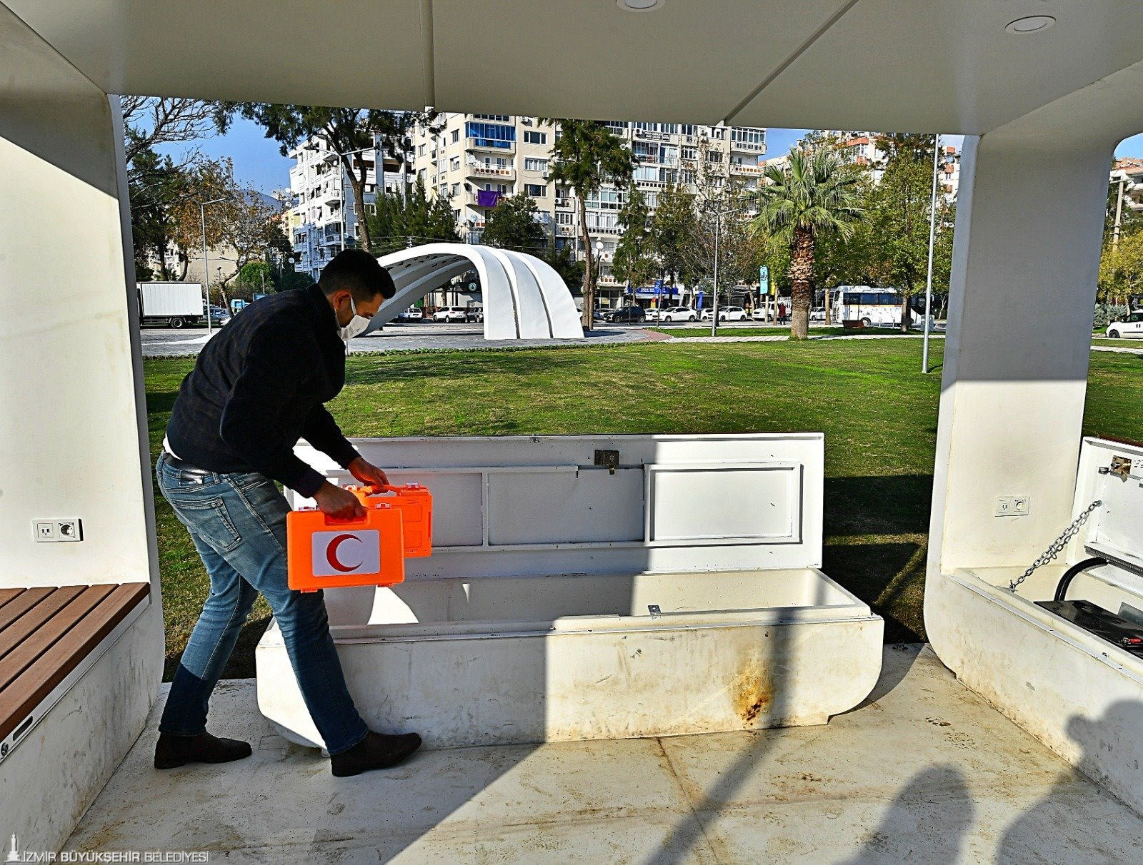 izmir Büyükşehir Belediyesi, Hasan Ali Yücel Parkı’na da üç modülden oluşan kent donatıları yerleştirdi. Kent donatılarında elektrik kesintilerine karşı güneş enerjisi sisteminin devreye geçirilmesi sağlandı. İhtiyaç duyulan malzemelerin depolanması için oturma birimlerinin altında kilitli depolar oluşturuldu. Depolara afet sonrası çadırlar kurulana kadar barınma amaçlı kullanmak üzere brandalar yerleştirildi.