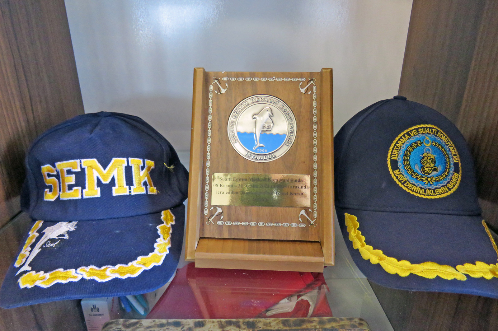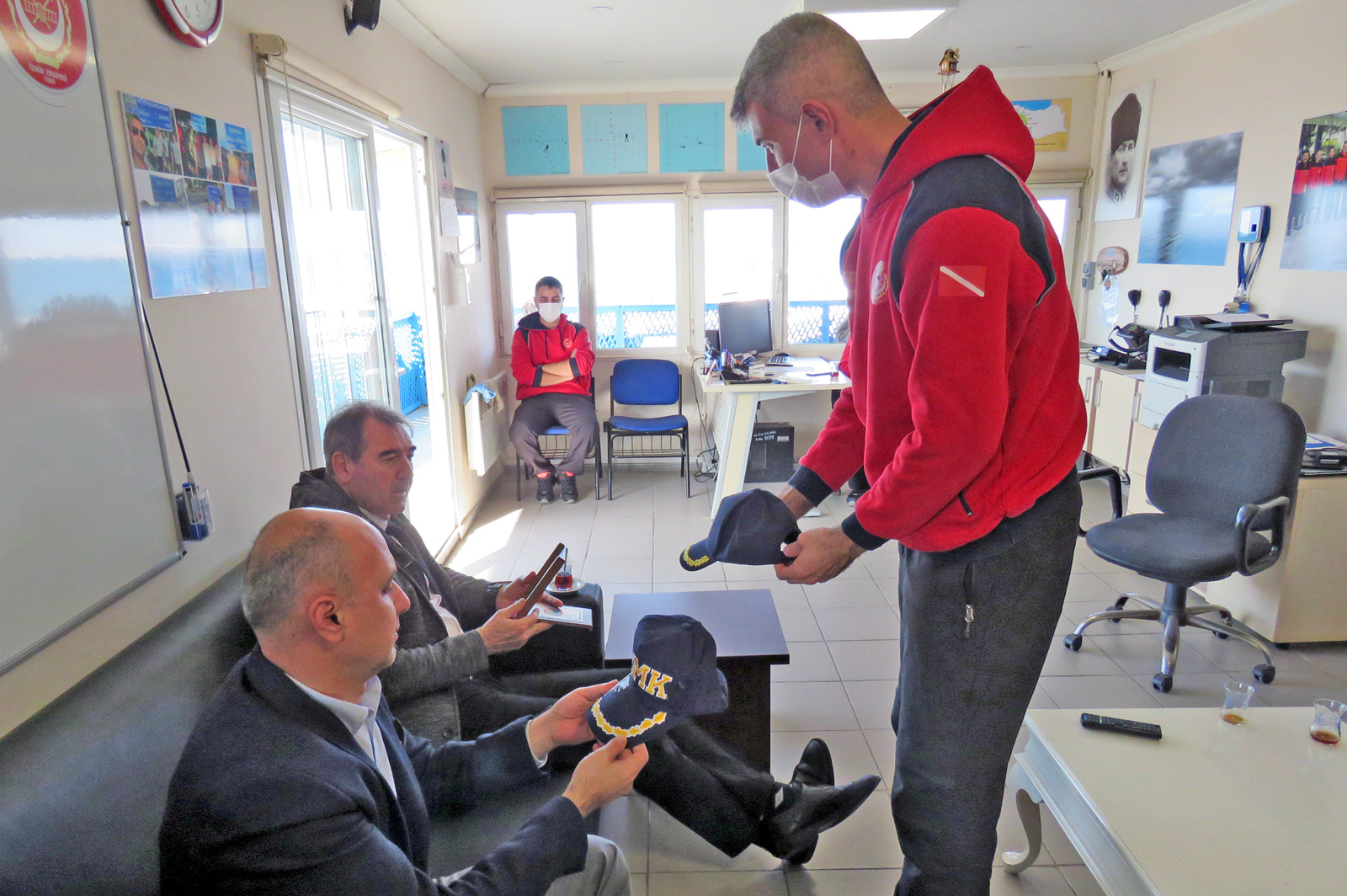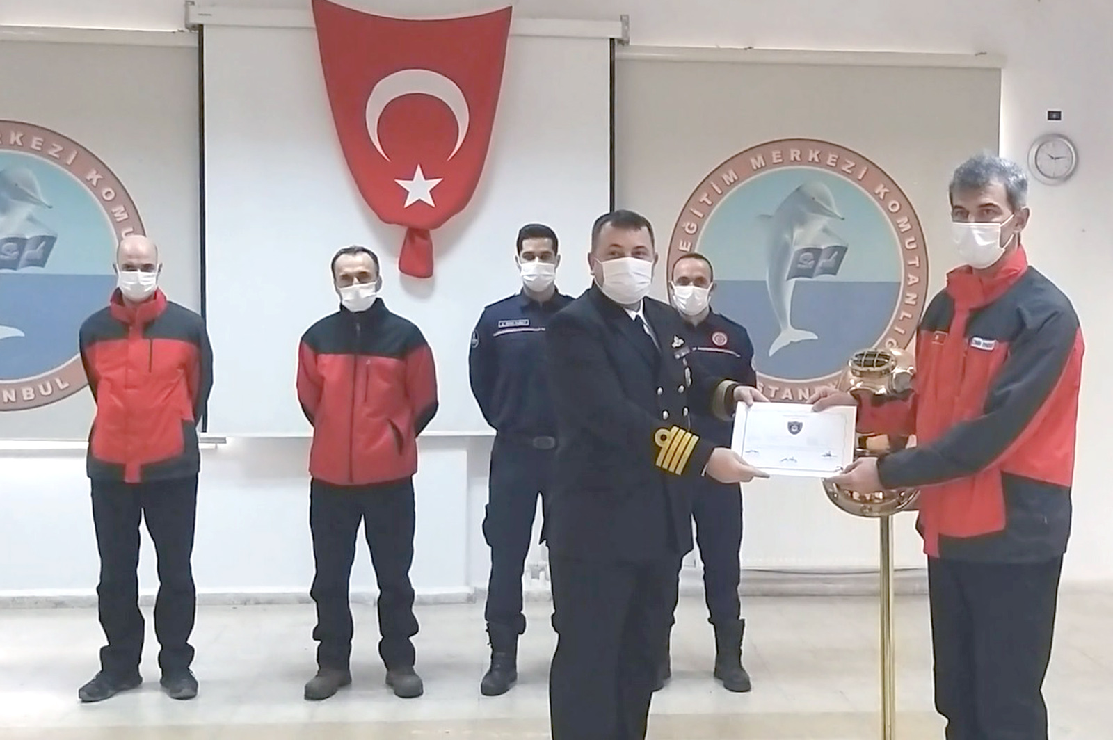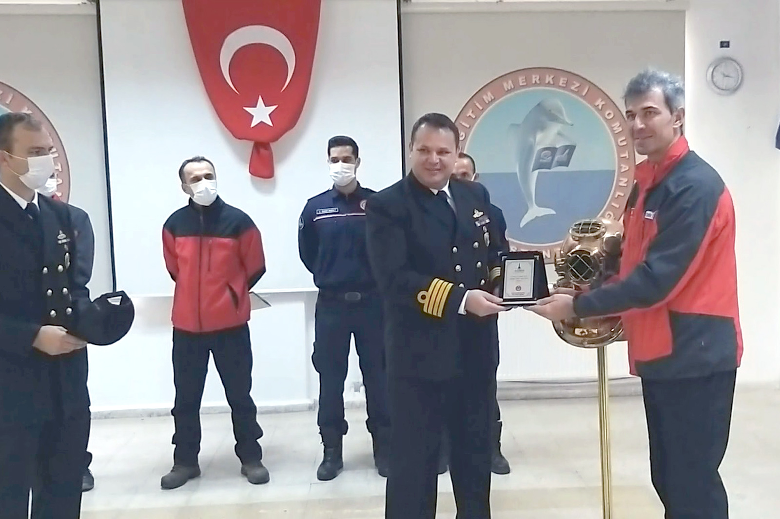 Su Altı Arama Kurtarma Ekip Amiri Erman Karademir, İzmir İtfaiye Dairesi Başkanlığı adına Sualtı Eğitim Merkezi Komutanlığı'ndan aldıkları plaketi takdim etti.
