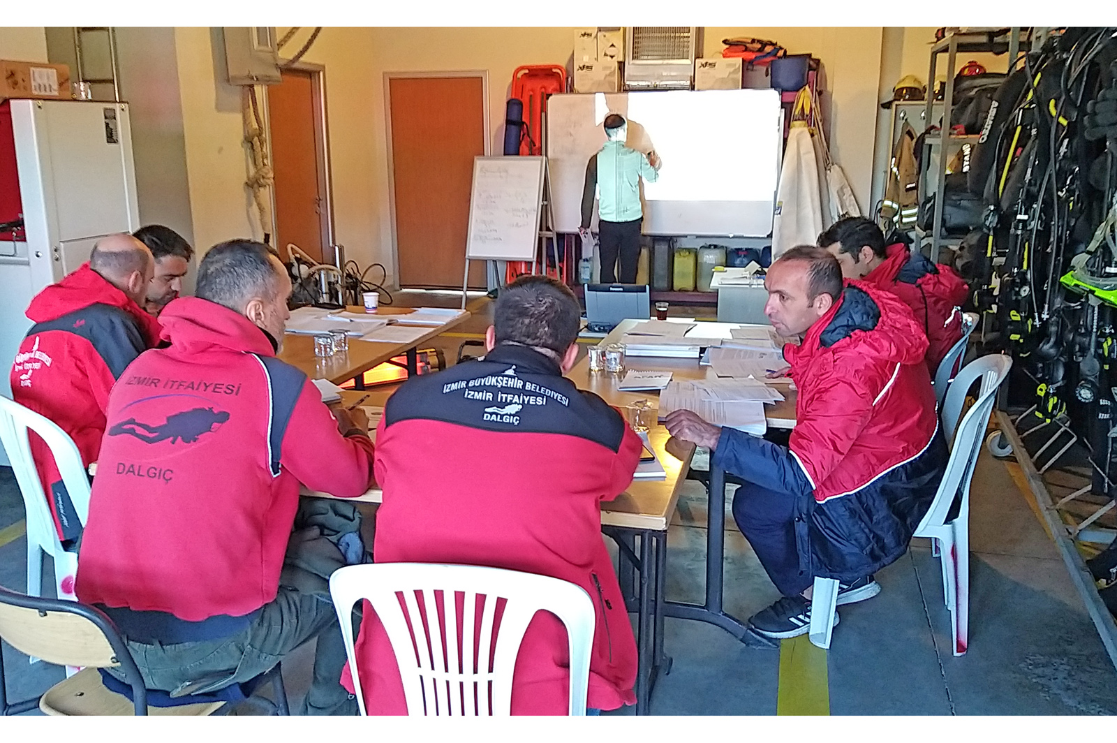 İzmir İtfaiyesi Dalgıçları, “dalış organizasyonu ve planlaması” altında denizde ileri dalış teknikleri arama kurtarma teknikleri olarak; “dalış fiziği ve prensipleri”, “dekomprasyon”, “yinelenen dalış ve irtifa dalış usulleri”, “hava devreleri”, “kompresör kullanımı”, “dalış anatomisi ve fizyolojisi”, “dalış hastalıkları ve kazaları”, “basınç odaları teorisi”, “denizde hayat kurtarma ve ilk yardım” konularında becerilerini geliştirdiler.