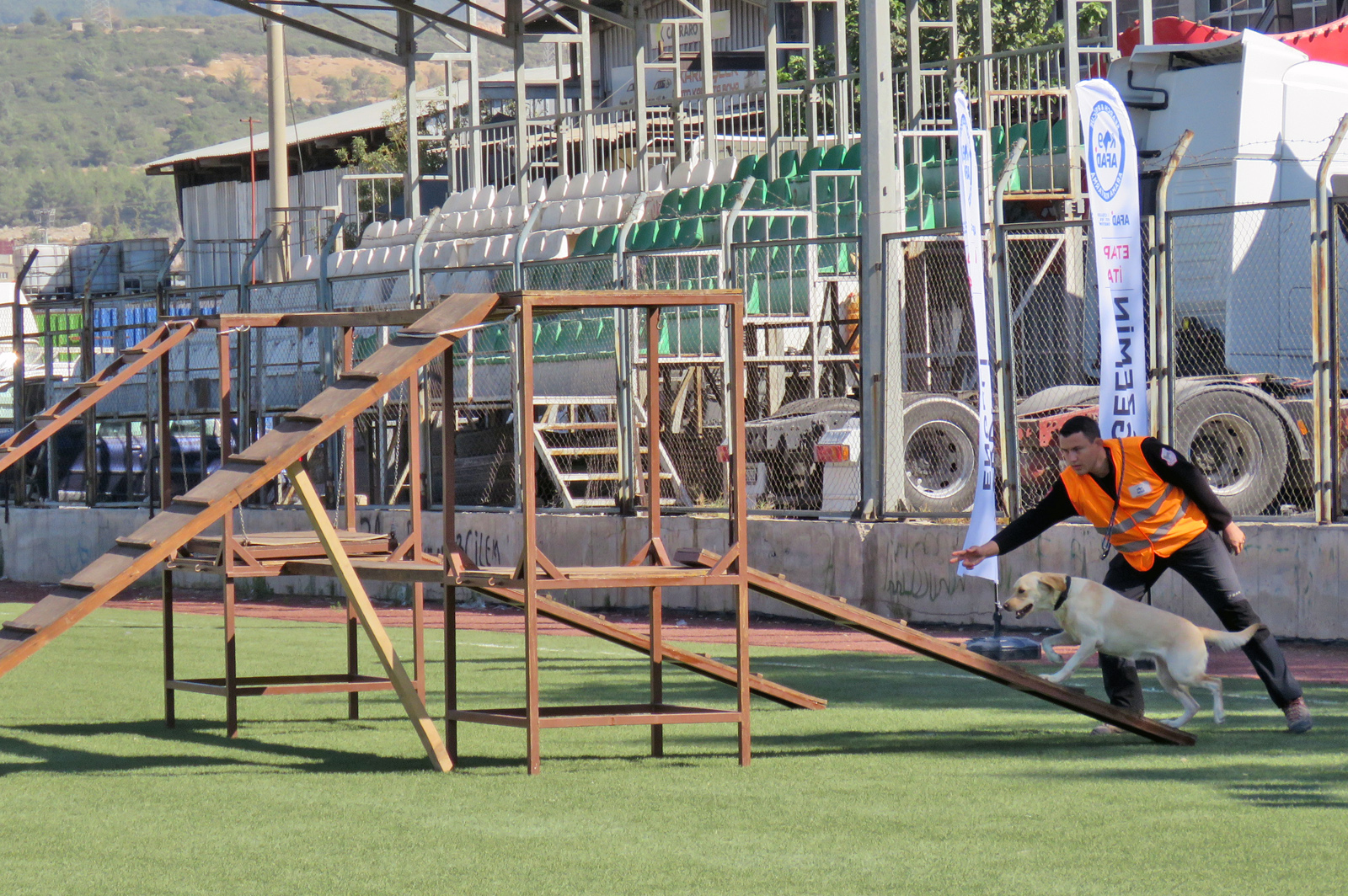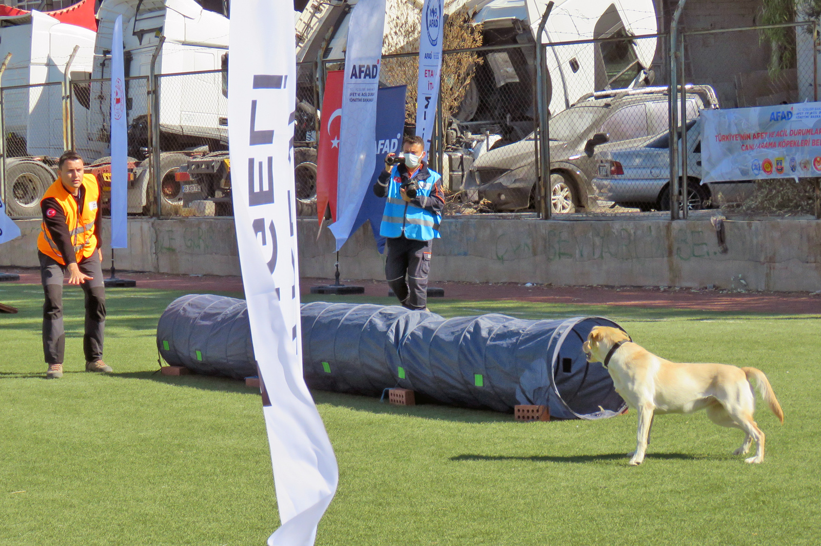 Sınavlarda itaat, çeviklik, sallanan zemin, tahta merdiven, engelli parkurunun ardından köpekler, farklı felaket senaryolarına göre enkazda arama kurtarma çalışması yapıyorlar.