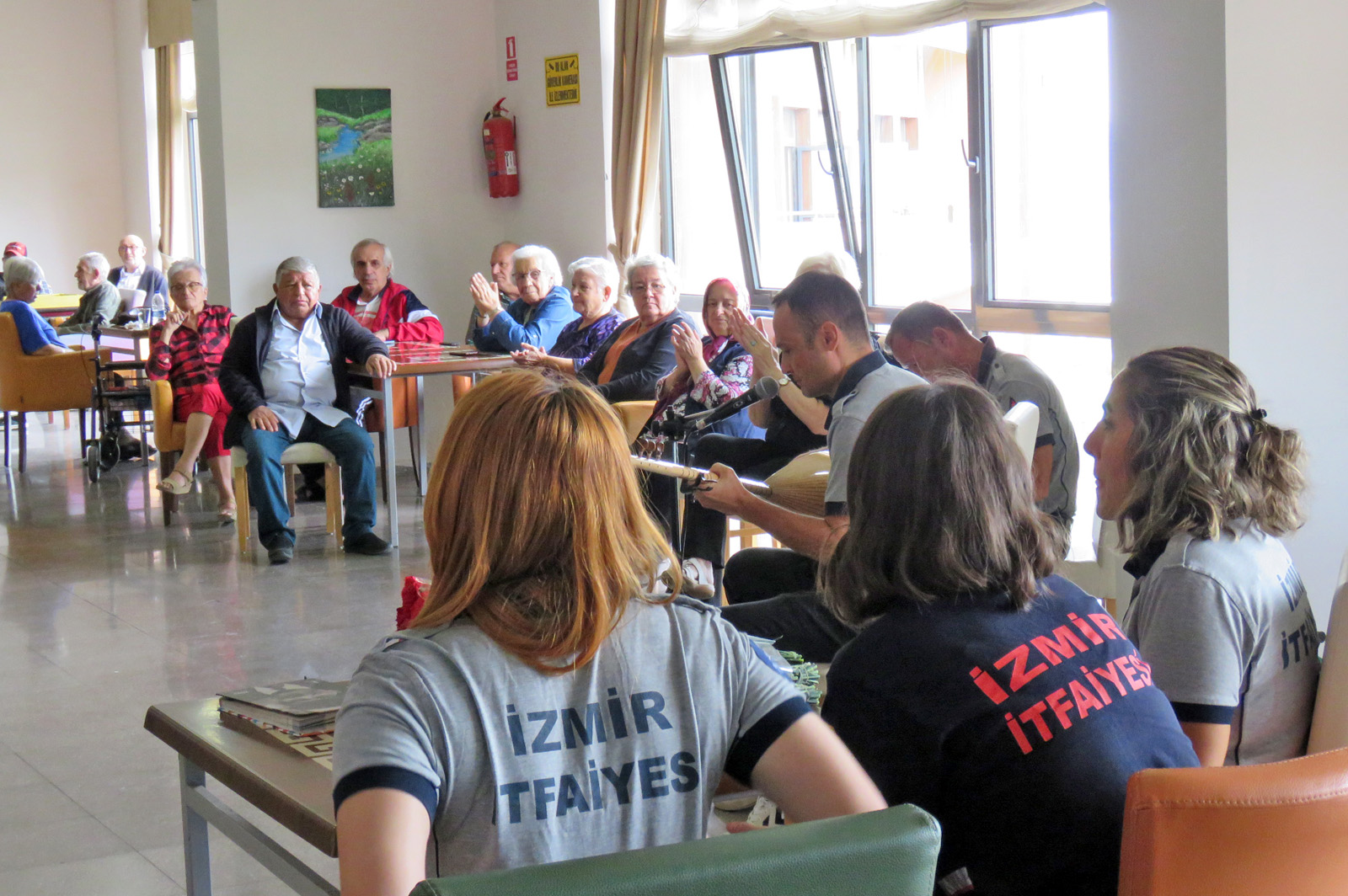 Ziyaret grubunda bulunan itfaiye erlerinden Sercan Sak bağlaması ve Murat Ataman Bendir'i ile huzurevi sakinlerine hoş bir süpriz de yaptılar.