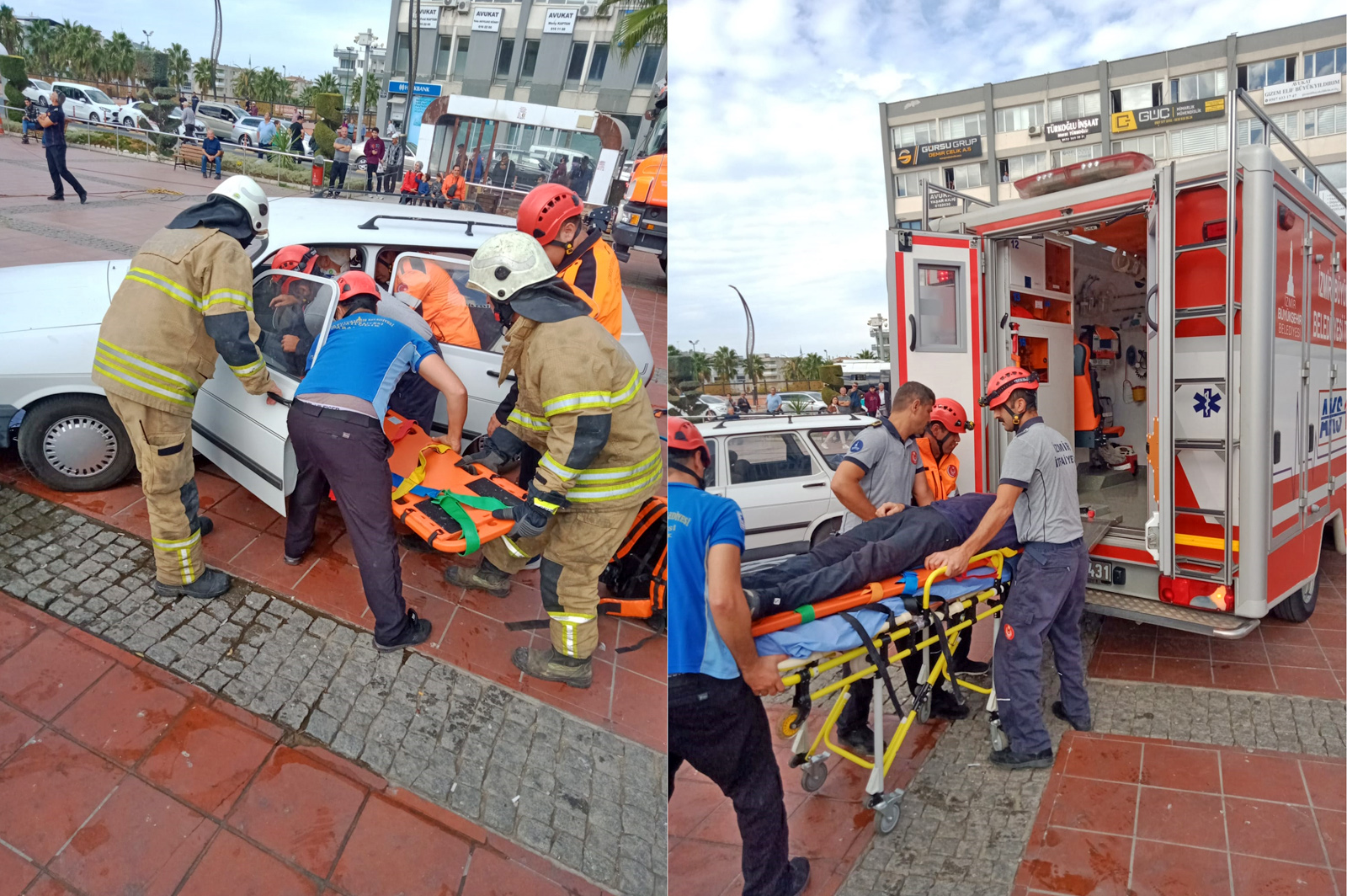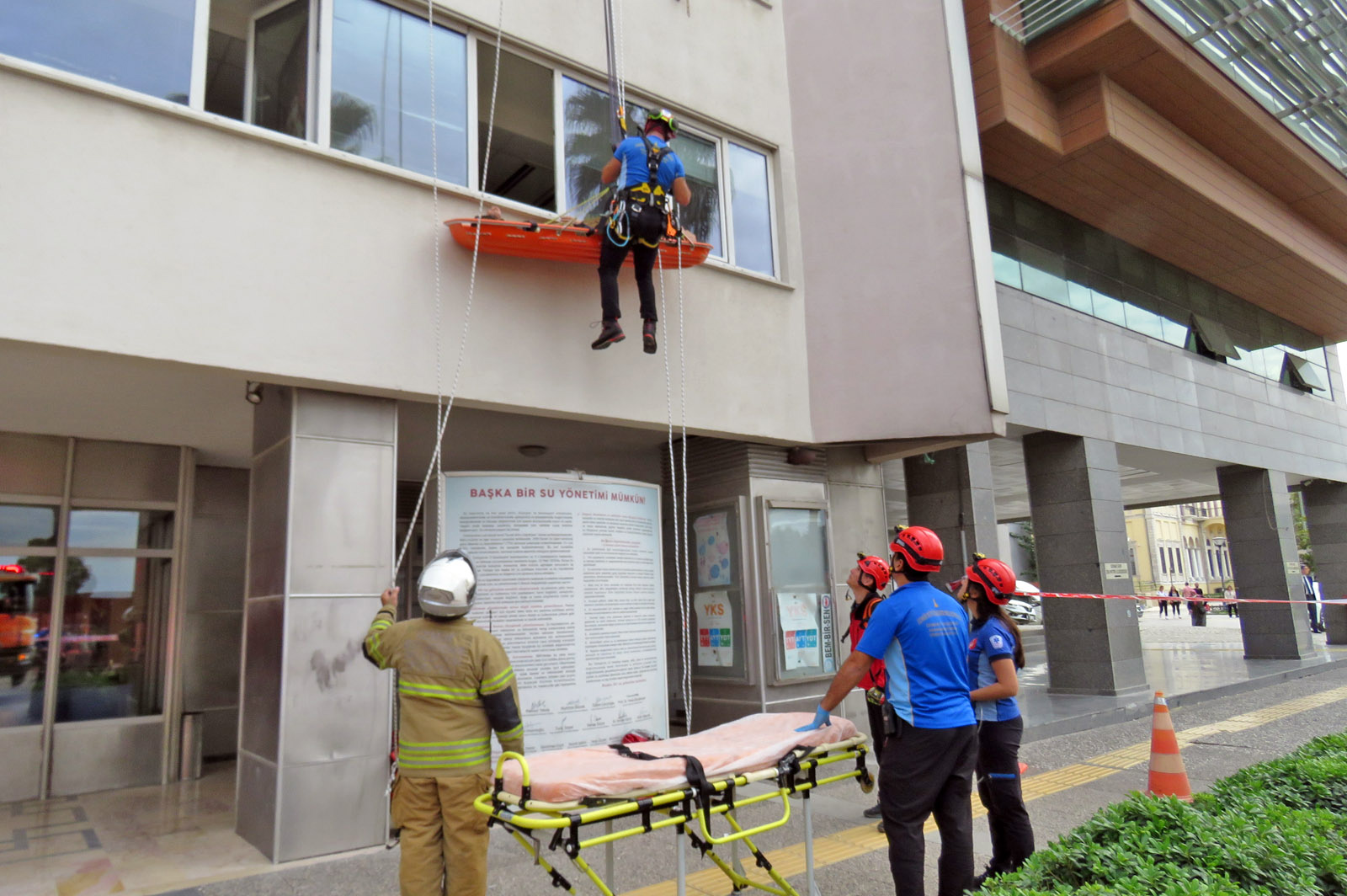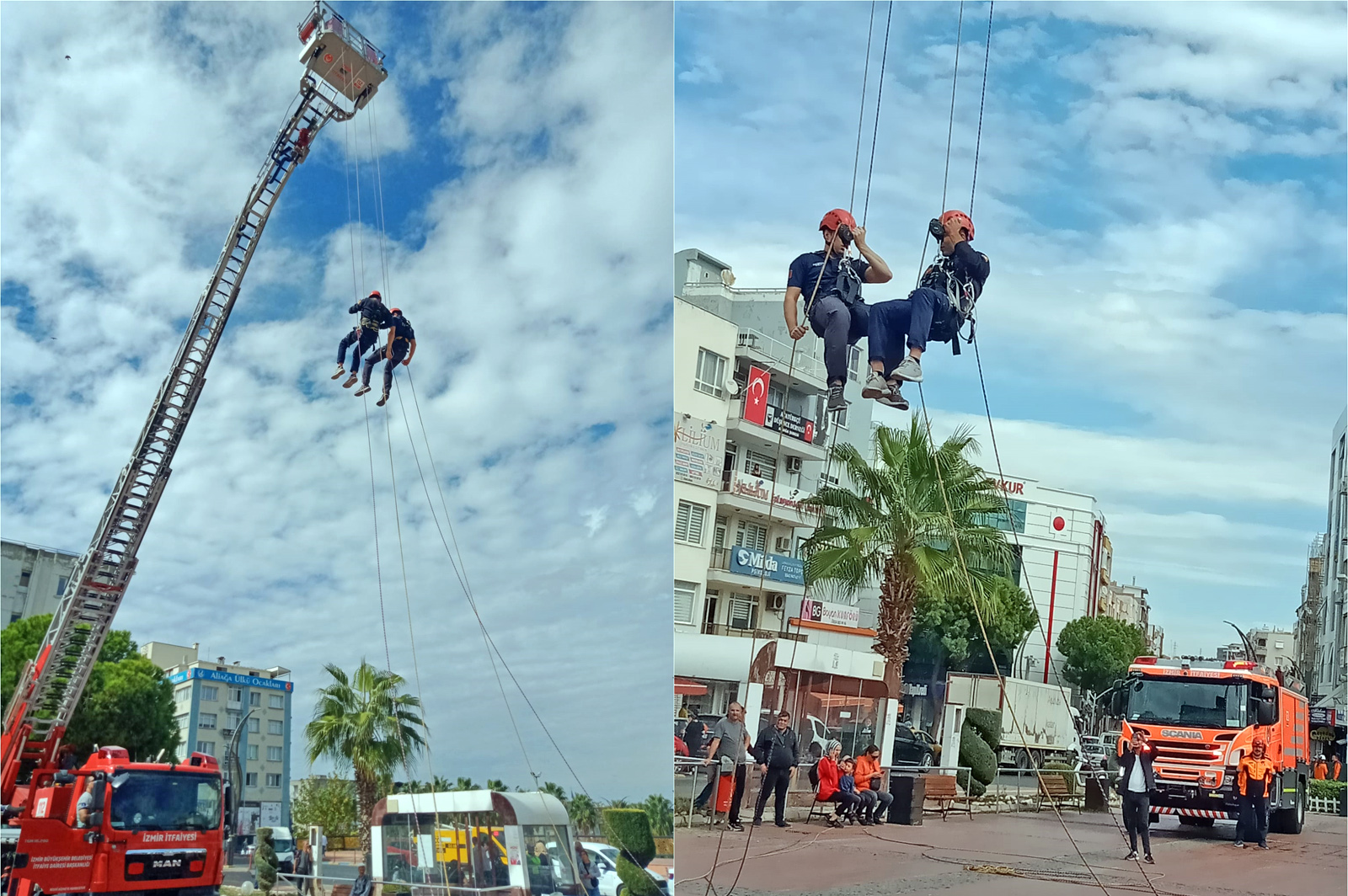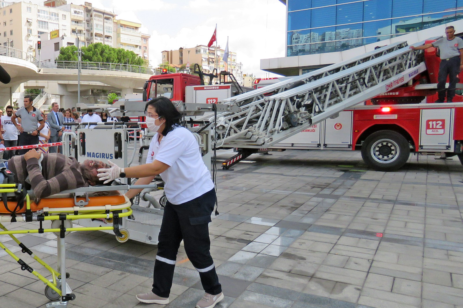 İzmir İtfaiyesinin, AKS, Kurtarma, Arazöz, Motorize ve Merdivenli Araçları ile gerçekleştirdiği tatbikatlarda, çeşitli senaryolar şeklinde gerçekleşen kaza ve yangınlarda mahsur kalan ve yaralı vatandaşlarda kurtarıldı.