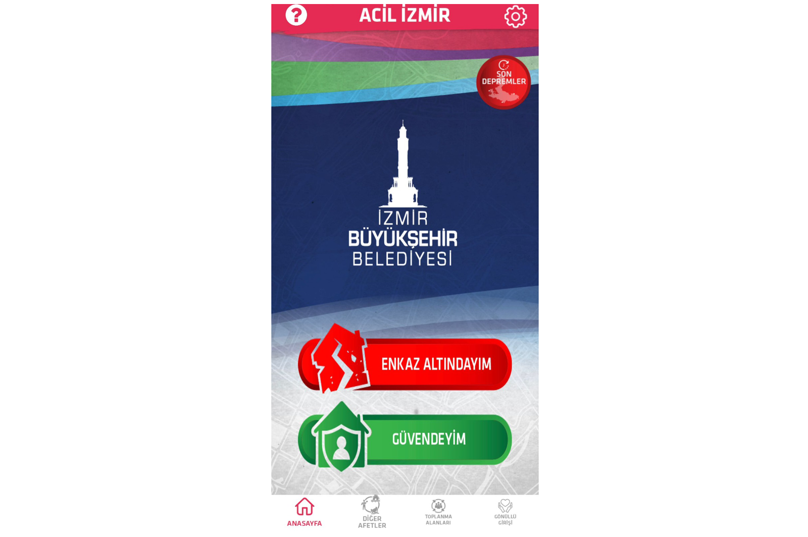 * Yurttaşlar “Güvendeyim” butonuyla daha önce oluşturdukları güven odalarında bulunan yakınlarına ve İzmir Büyükşehir Belediyesi İtfaiye Birimi yetkililerine konum bilgilerini gönderebiliyor, güvende oldukları bilgisini mesajla paylaşabiliyor.